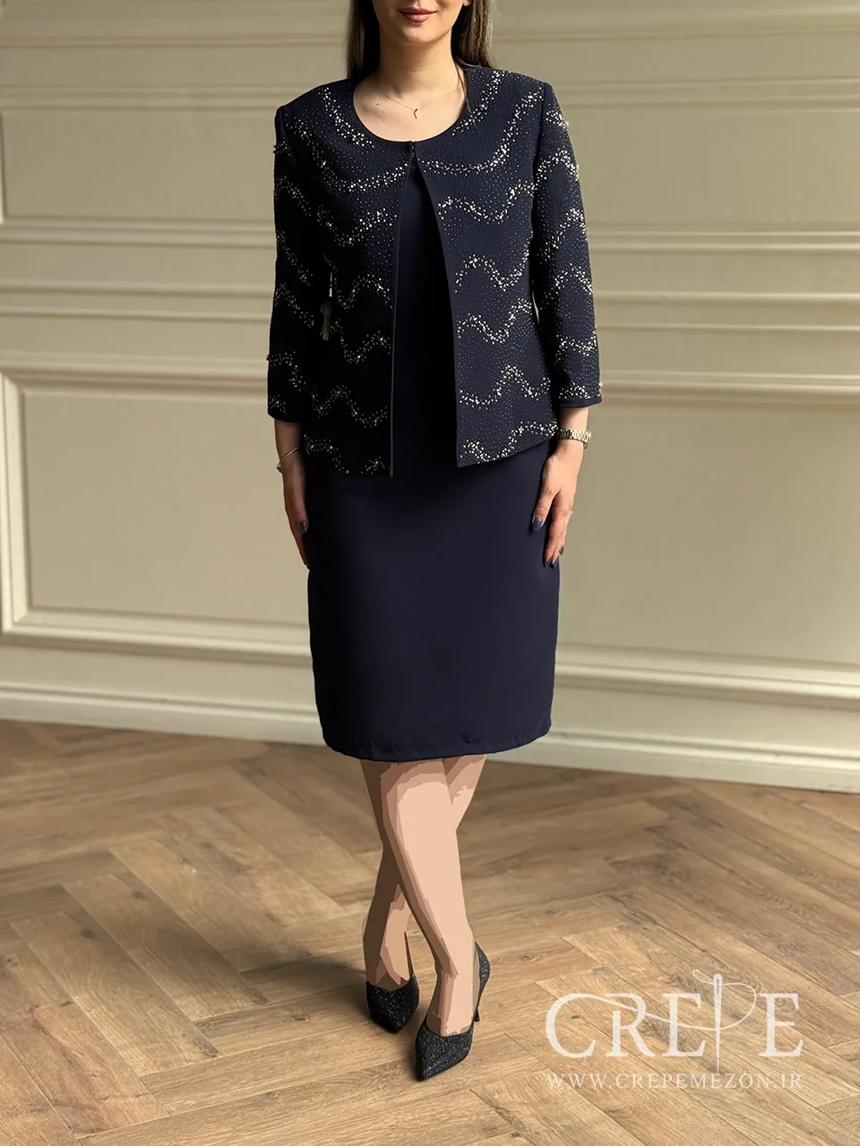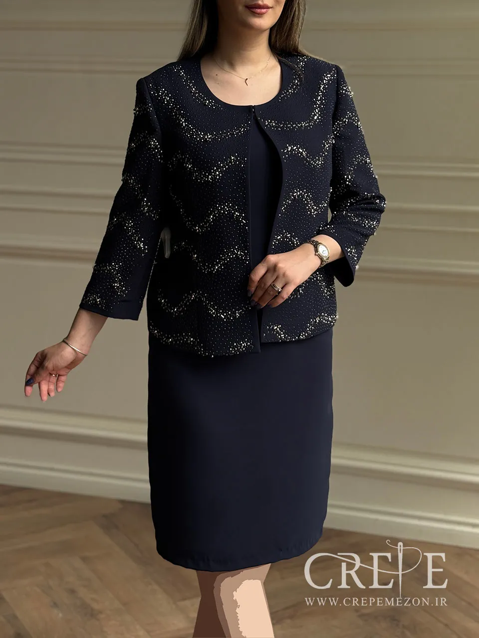 کت دارای یقه گرد است که به سادگی و زیبایی طراحی کمک میکند. آستینهای بلند کت به آن ظاهری رسمی و شیک میدهند. دو طرف جلویی کت و آستینها با سنگ و منجوق به شکل موجدار طراحی شدهاند. این جزئیات سنگدوزی به کت جلوهای خاص و مجلسی میبخشد و توجه را به زیباییهای آن جلب میکند. سارافون طراحی شده به صورت بدون آستین است که به آن حس سبکی و راحتی میدهد. این طراحی به ویژه در فصلهای گرم یا در مهمانیهای تابستانی مناسب است. یقه گرد سارافون به سادگی و شیک بودن آن افزوده و میتواند به راحتی با اکسسوریهای مختلف ست شود.