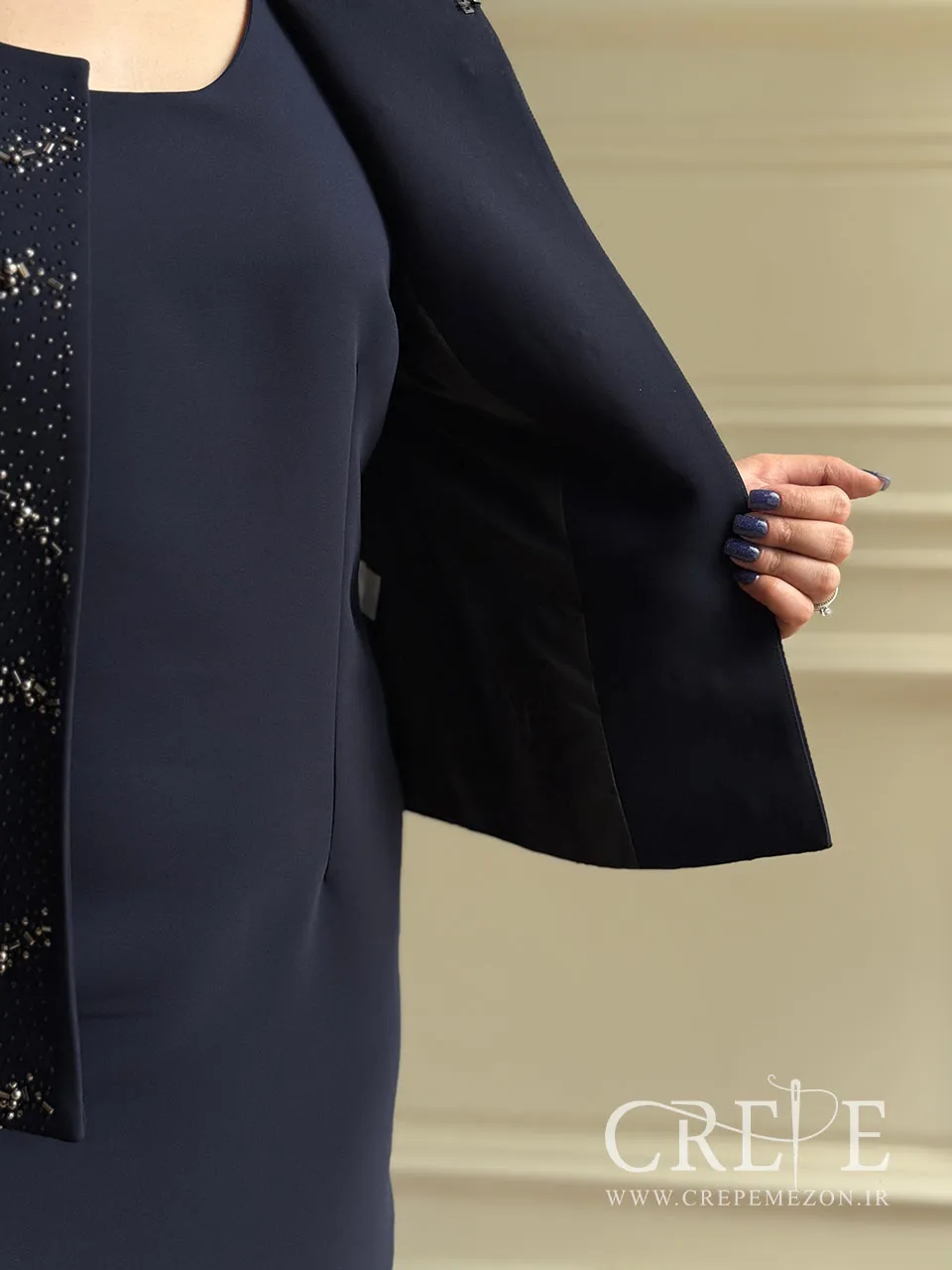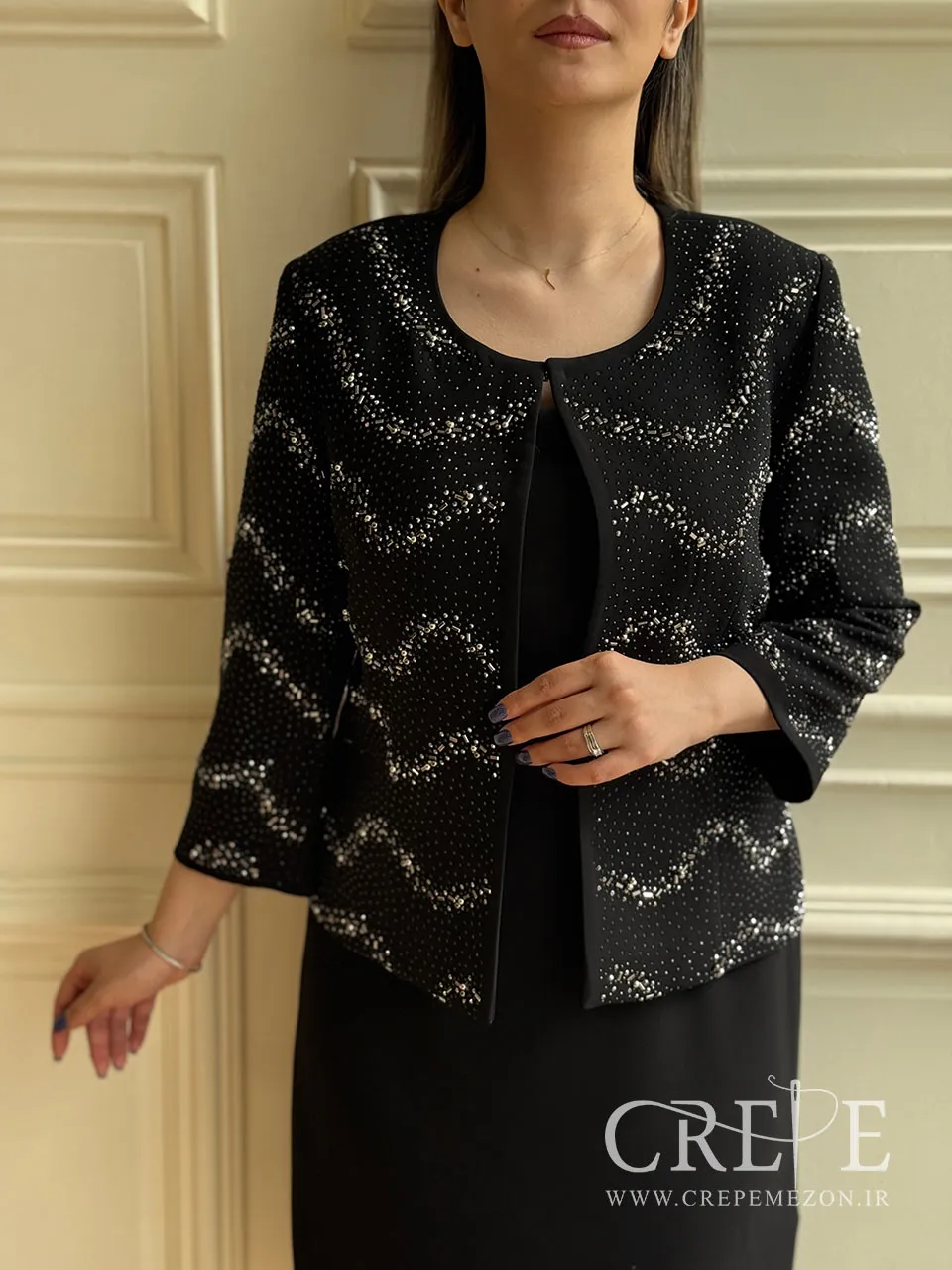کت و سارافون سنگدوزی یک ست مجلسی که از جنس کرپ کنزو بوده و در سایزبندی54-44 و رنگبندی مشکی و سرمه ای موجود است. کت تمام آستر بوده و سارافون برش اندامی دارد.