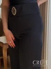 کمری شلوار پهن طراحی شده است که باعث ایجاد راحتی بیشتر و همچنین ظاهری کمر باریکتر میشود. این ویژگی به خصوص برای افرادی که میخواهند توجه را به ناحیه کمر خود جلب کنند، مناسب است. در قسمت مرکز کمر، یک سگک طلایی باشکوه قرار دارد که به جذابیت و زیبایی شلوار میافزاید. این جزئیات طلایی میتواند به عنوان یک نقطه کانونی در لباس شما عمل کرده و ظاهری لوکس ایجاد کند. شلوار از بغل زیپ دارد که به راحتی پوشیده و درآورده میشود. این نوع طراحی باعث میشود که شلوار به خوبی بر روی بدن بنشیند.