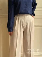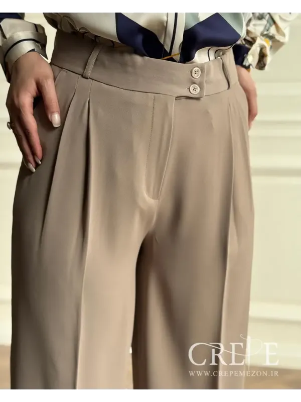 شلوار کرپ کنزو یک شلوار مجلسی پیله دار که از پارچه کرپ کنزو تهیه شده و در سایزبندی 46-38 و رنگبندی خاکی و استخوانی موجود است. مدل شلوار از بالا راسته است.