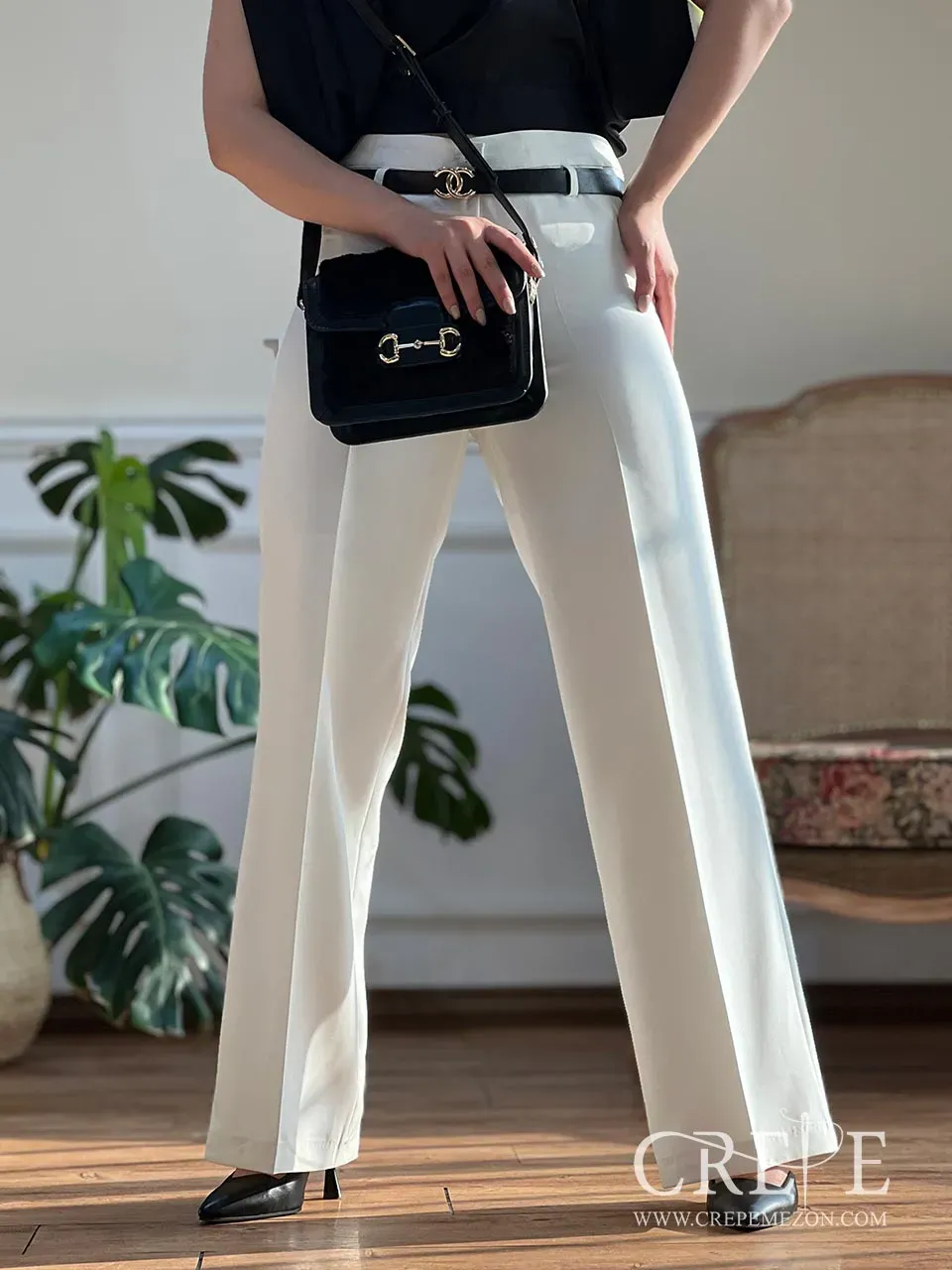 شلوار در رنگهای مشکی، سفید، کرم و سرمهای موجود است. این تنوع رنگی به شما این امکان را میدهد که با توجه به سلیقه و نیاز خود، شلوار مناسبی انتخاب کنید. رنگهای تیره مانند مشکی و سرمهای برای مجالس رسمیتر مناسب هستند، در حالی که رنگهایی مانند سفید و کرم به فضایی روشنتر و دوستانهتر کمک میکنند. شلوار دارای یک کمربند چرم با سگک طلایی است که به آن ظاهری لوکس و شیک میبخشد. این کمربند نه تنها زیبایی شلوار را افزایش میدهد، بلکه به تنظیم بهتر اندازه شلوار کمک میکند. همچنین، وجود زیپ در قسمت جلو شلوار، به طراحی آن ظاهری مدرن و کاربردی میدهد و امکان پوشیدن و درآوردن آن را آسانتر میکند.