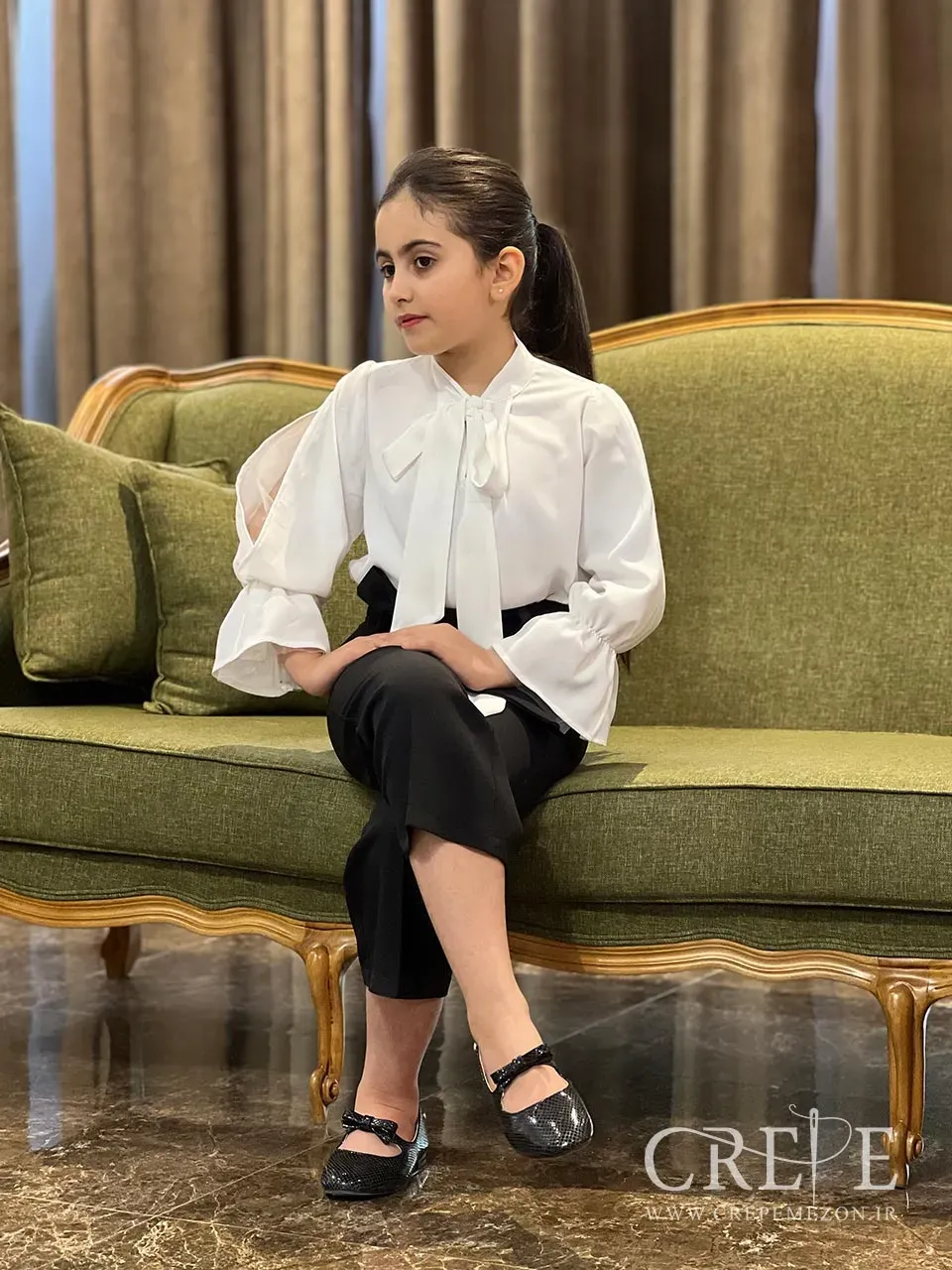 برای این شومیز یک مدل آستین زیبای طراحی شده به این صورت که روی آستین برش خورده و به ظاهر قسمت بازو خالی ولی زیر آستین تور دوزی شده و وقتی دست حالت جمع به خودش میگیره مابین این برش باز شده و تور آستین دیده میشود و سر دست آستین هم چین دوزی شده هم تور هم کرپ الیزه قسمت مچ آستنین با اون چین دوزی که شده به زیبای دیده می شود .
