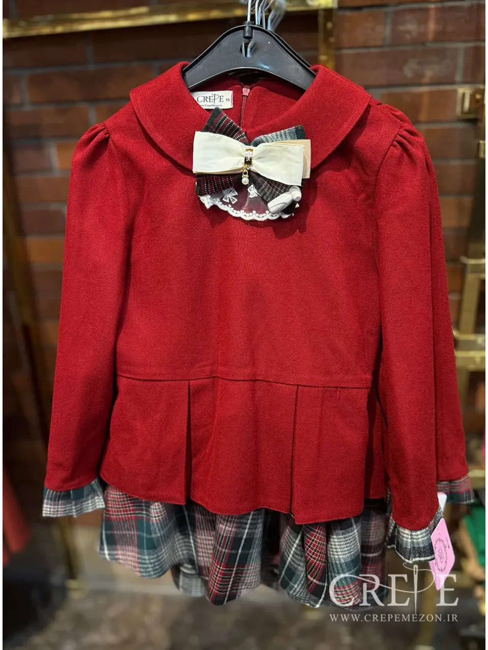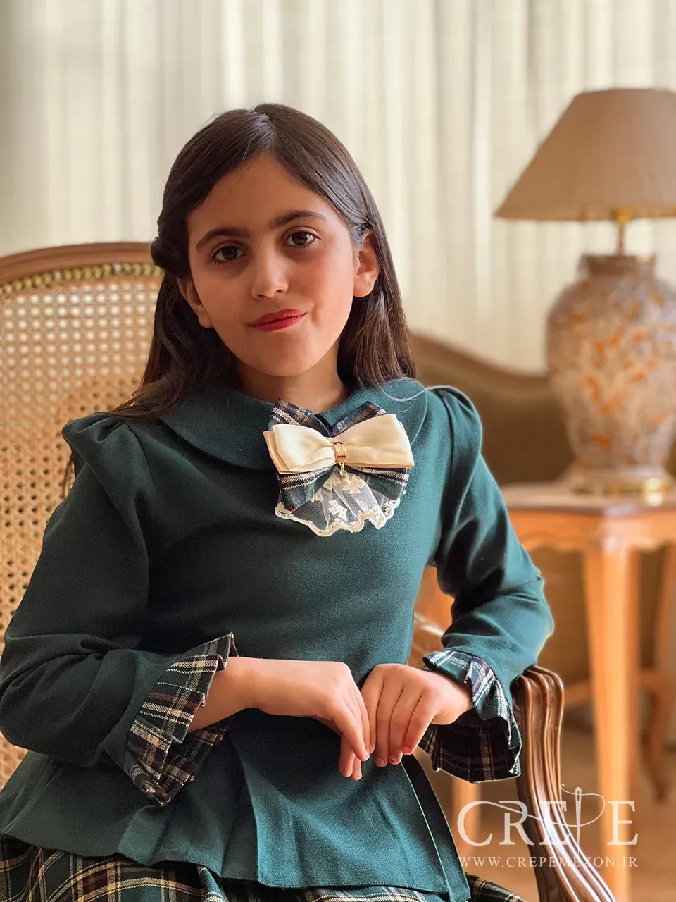 که از سه تیکه تشکیل شده . این ست زیبا از یک بلوز ساده کشمیر تک رنگ با دامن چهارخونه با رنگبندی ترکیبی وگل سینه که ترکیبی از تور وساتن وکشمیره