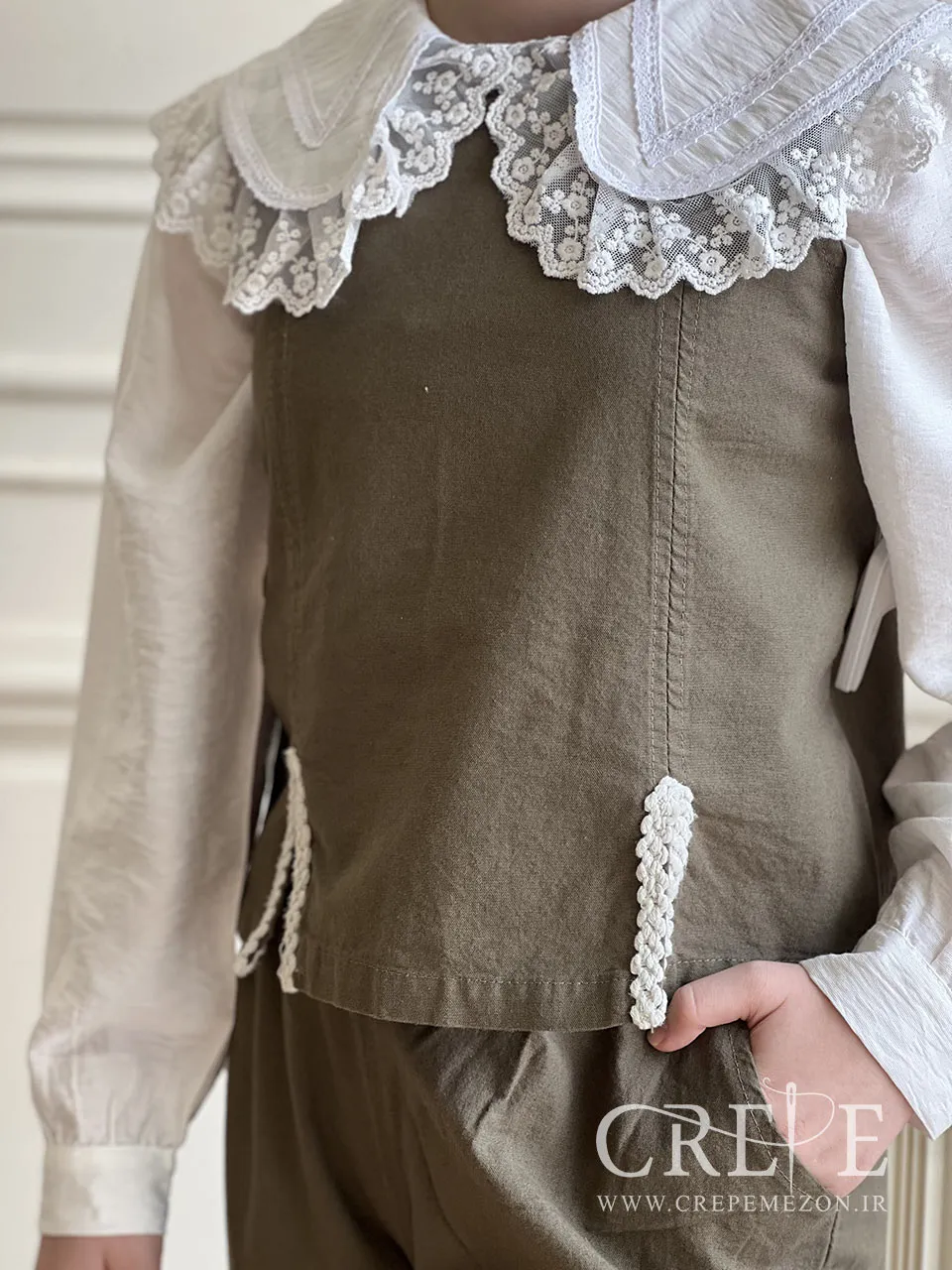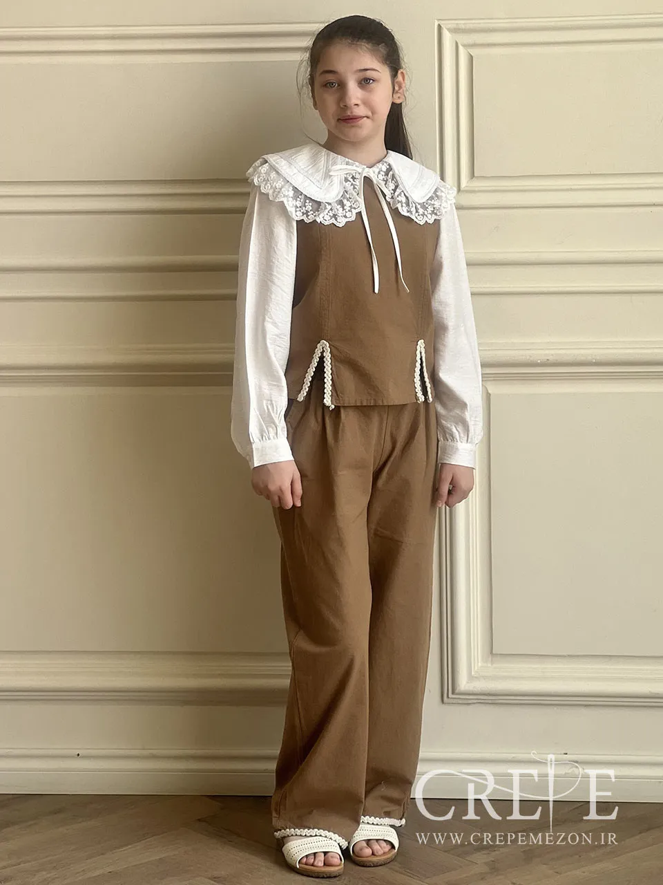 شلوار این ست از با راسته دوخته شد با کمر تماما کش دوزی شده فقط قسمت جلو شلوار به اندازه 15 سانت بدون کش دوخته شده برای ایستای بهتر شلوار و جیب بغل در دو طرف کمر شلوار دوخته شده ، قسمت دمپای شلوار رو با همان نوارهای کنفی که روی قسمت جلو تاپ دوخته شده ، چرخ شده تا یک ست زیبا و جذاب داشته باشید برای استفاده روزمره ودورهمی های دوستانه