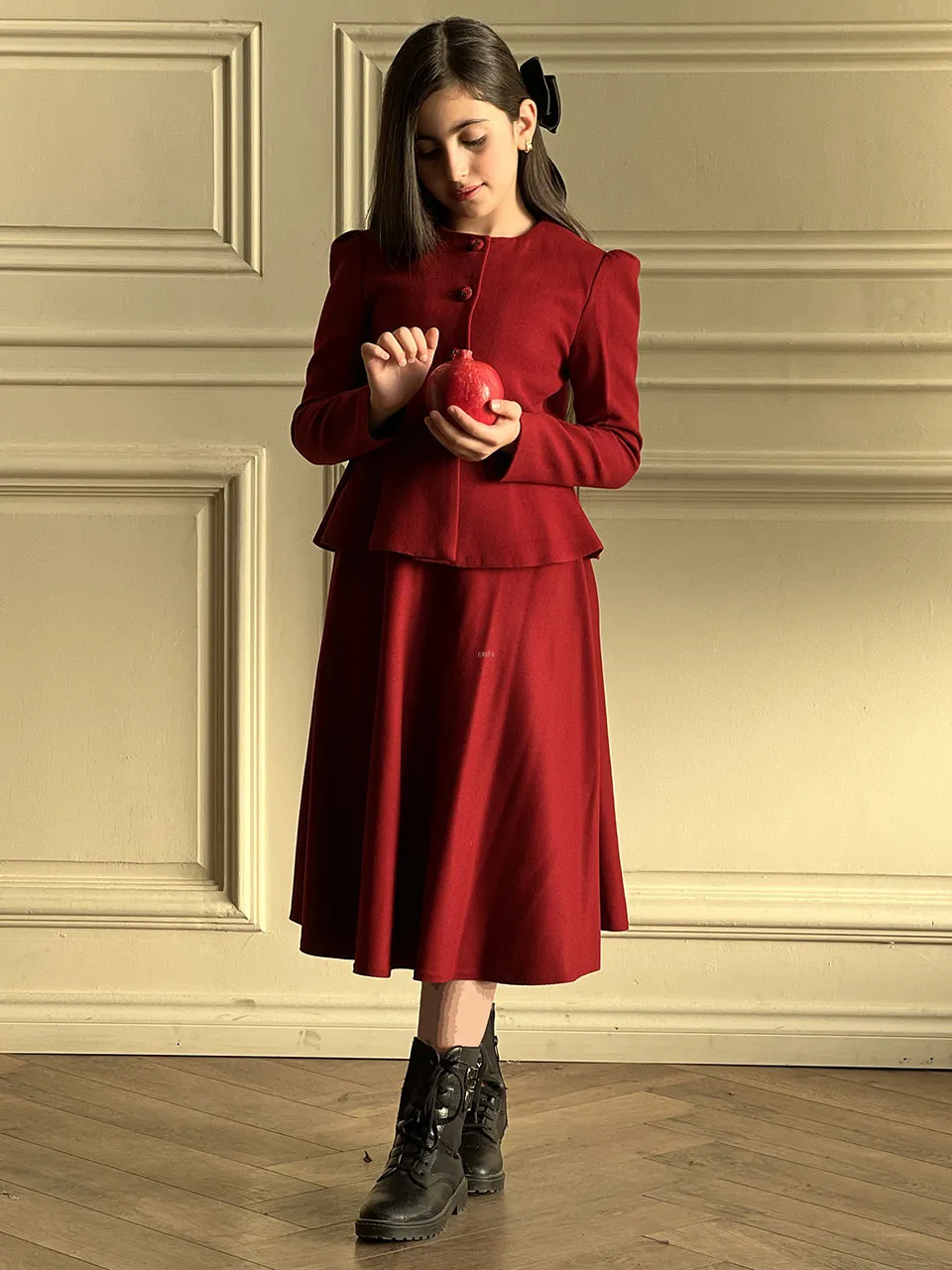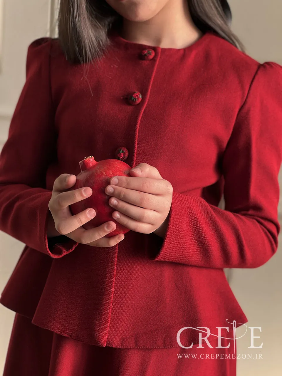 دکمه های کت از رنگ خود کت و ساده طراحی ودوخته شده ، و در قسمت کمر کت یک برش افقی داده شده و قسمت پایین کت رو از بالا کت متمایز کرده به طوری که قسمت پایینی کت به صورت کلوش برش خورده و وقتی به قسمت بالای کت وصل میشه حالت کلوش قسمت پایینی کت بسیار زیبا و خاصش کرده و چین زیبا رو ایجاد میکنه و حالت عروسکی به کت میده ودر حین ایتای زیبای بالاتنه کت که حالت رسمی و کلاسیک داره قسمت پایینی کت حالت عروسکی و پرنسسی به این ست زیبا میده .