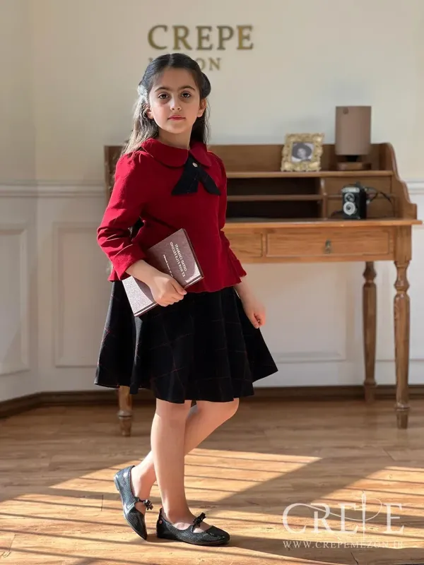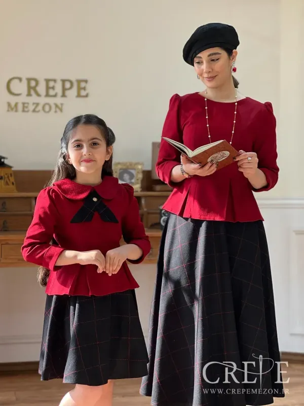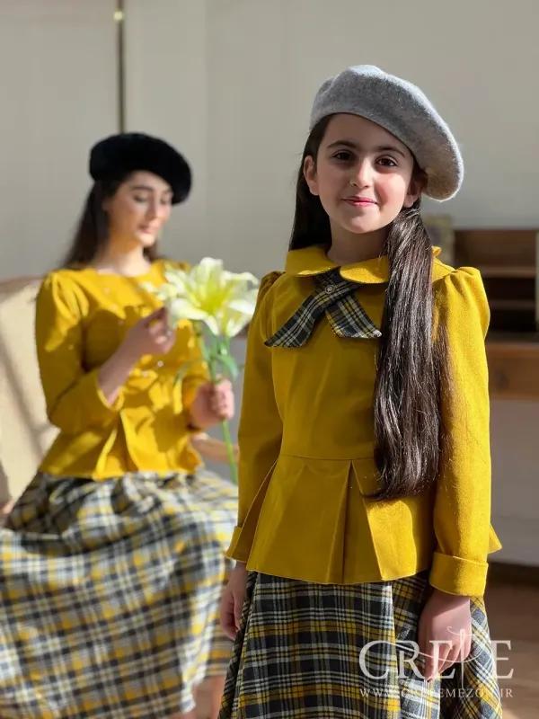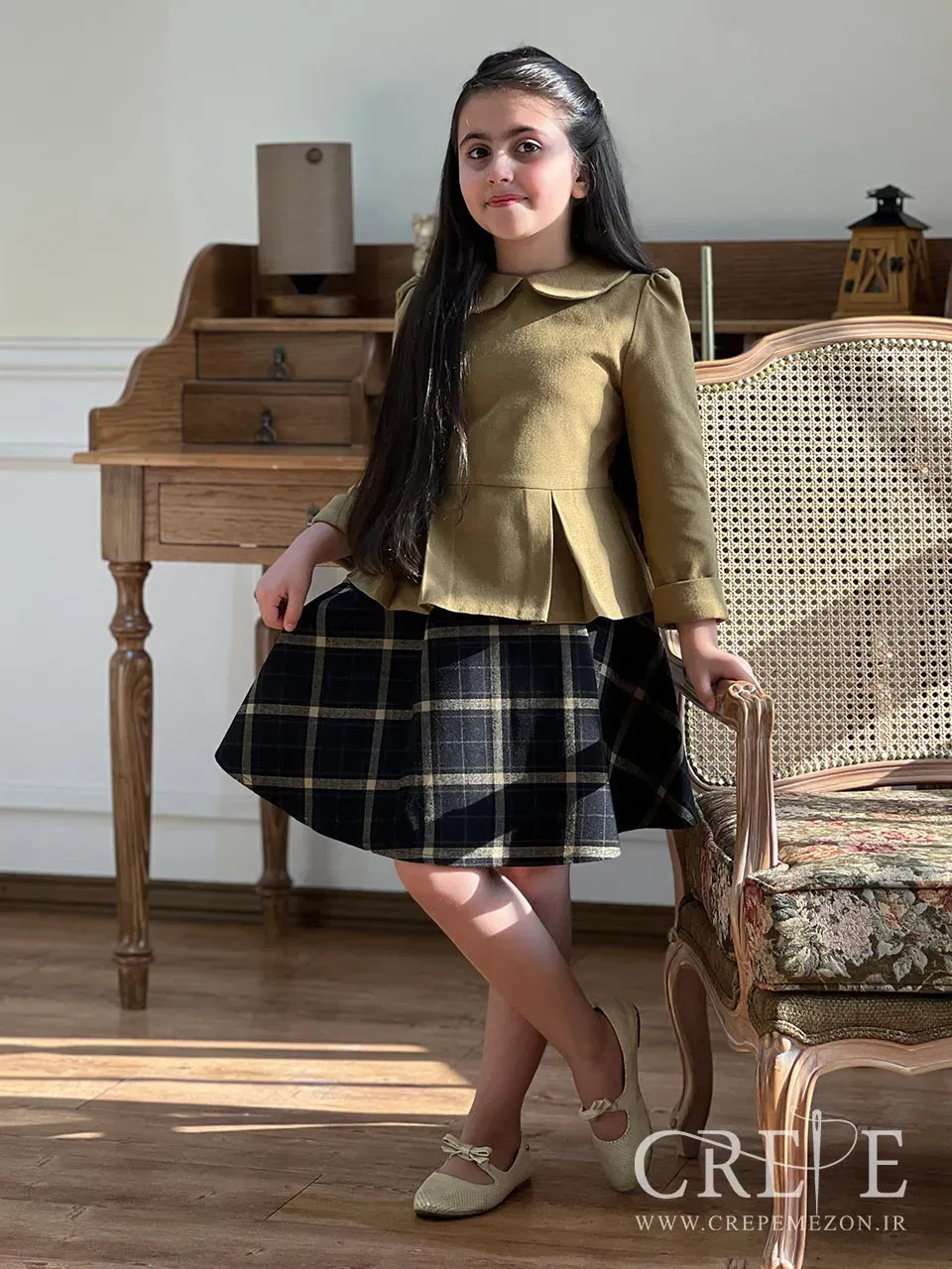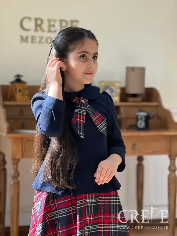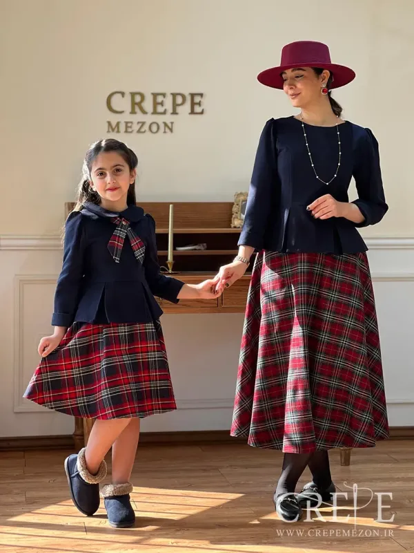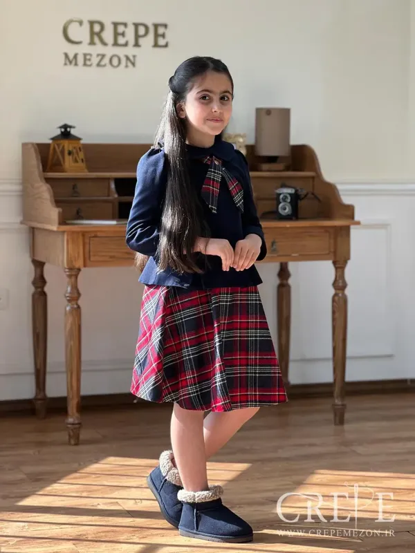 که از سه تیکه تشکیل شده . این ست زیبا از یک بلوز ساده کشمیر تک رنگ با دامن چهارخونه با رنگبندی ترکیبی وگل سینه که ترکیبی از تور وساتن وکشمیره