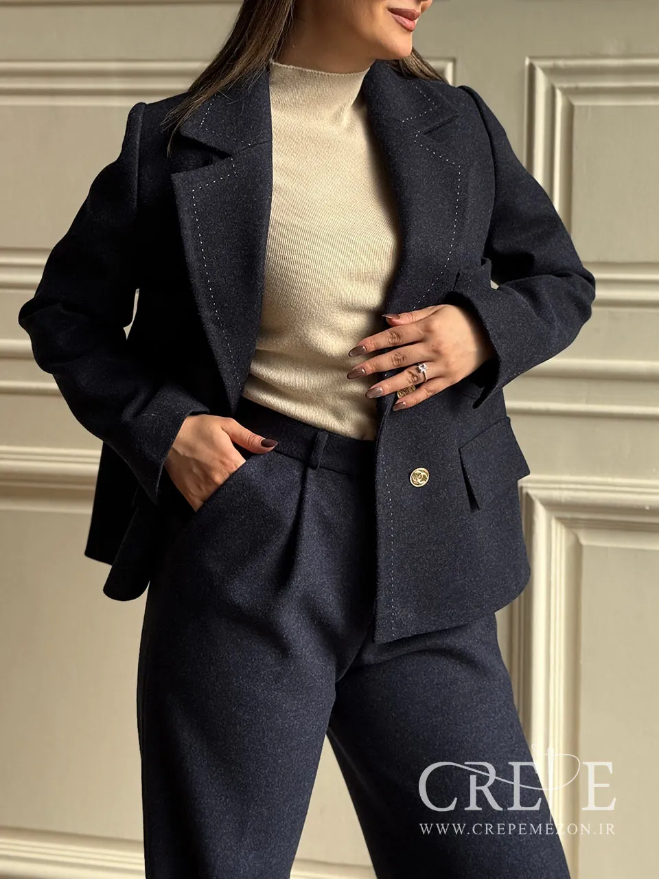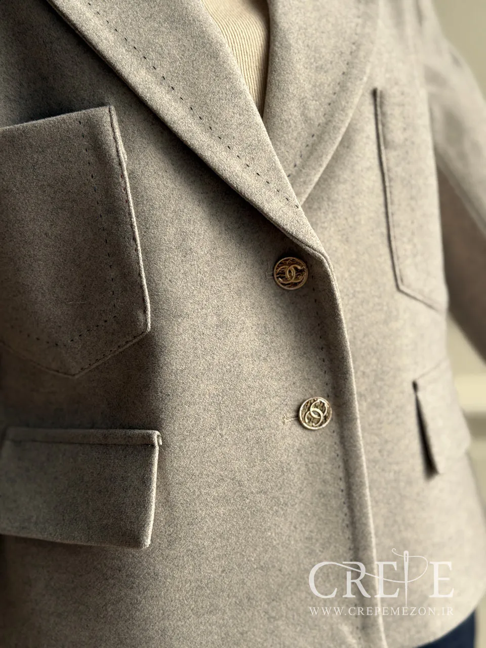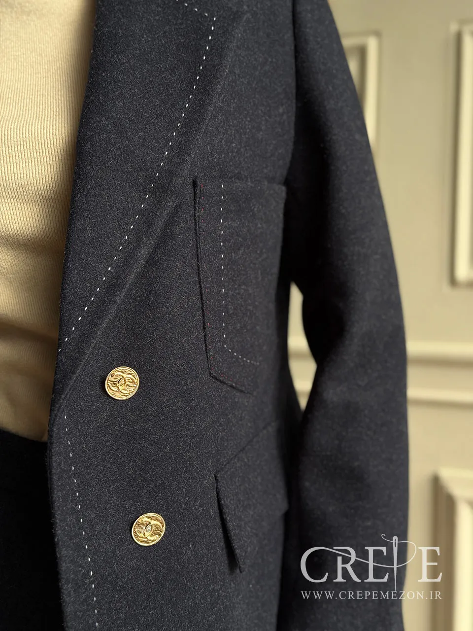 این کت فوتر پاییزه دارای دو فیلتاب جیب است که بیشتر جنبه تزئینی دارد و کاربردی نیست. همچنین، دو جیب کاربردی در بالای سینه وجود دارد که میتوان از آنها برای نگهداری اشیاء کوچک استفاده کرد. این ترکیب جیبها به طراحی کلی کت زیبایی و جذابیت بیشتری میبخشد. کت دارای دو دکمه زیبا در جلو است که به راحتی بسته میشود. این دکمهها نه تنها کاربردی هستند بلکه به طراحی این مانتو کتی کوک دوزی جلوهای شیک و مدرن میبخشند. یقه انگلیسی این کت به آن ظاهری کلاسیک و شیک میدهد. این نوع یقه به راحتی با دیگر لباسها ترکیب میشود و به استایل شما عمق و جذابیت بیشتری میبخشد.