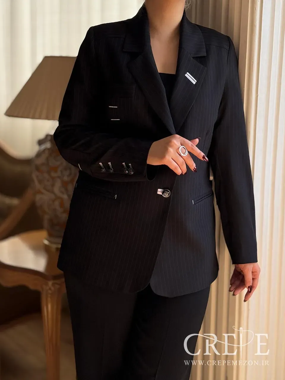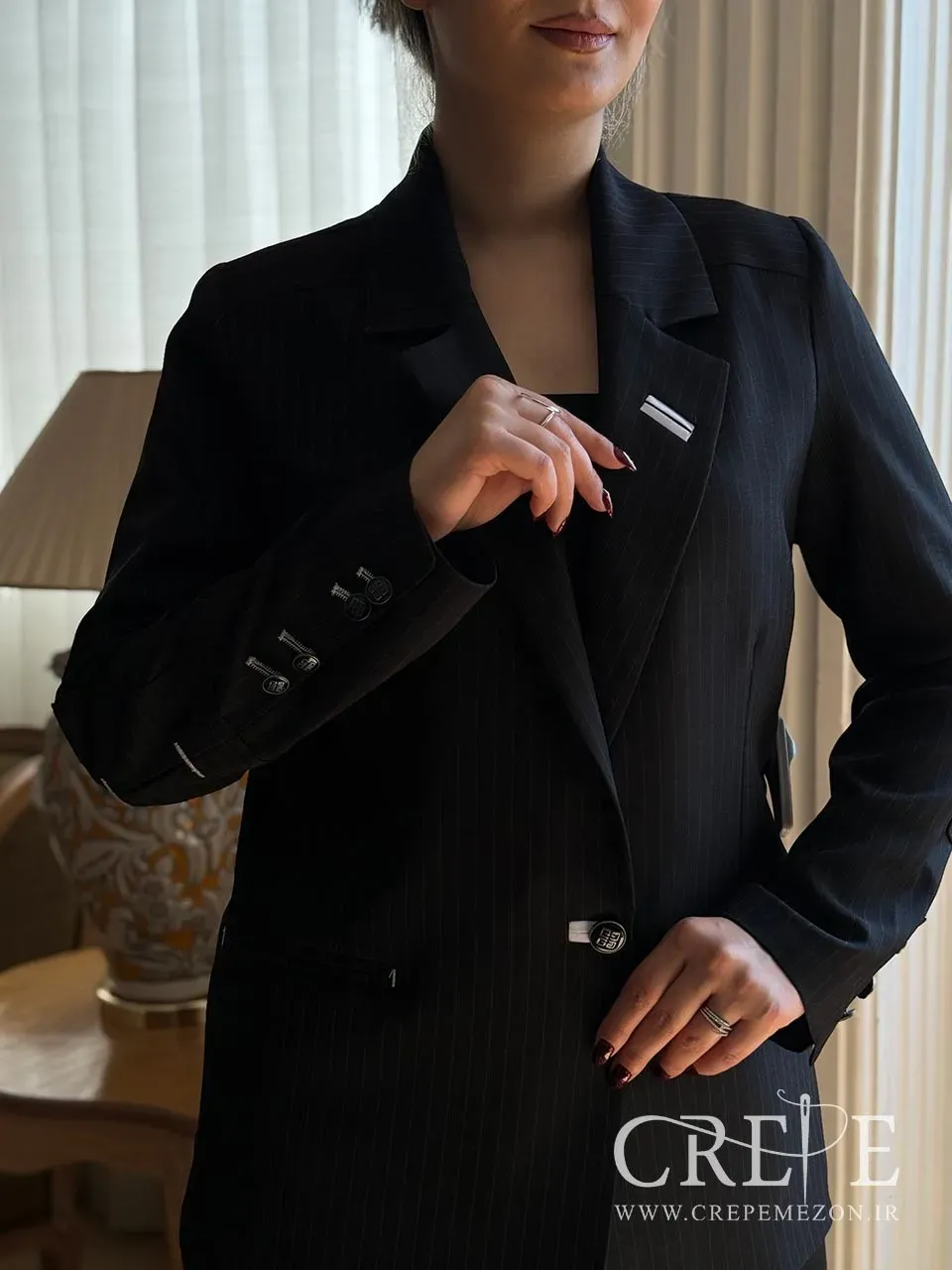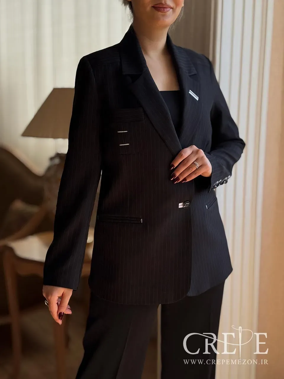 کت تک جیب فیلتو یک مانتو کتی زیبا که از جنس کرپ کش کجراه بوده که این جنس، نرم و انعطافپذیر بوده و زیبایی خاصی به مانتو میبخشد. این مانتو کتی دارای آستینهای بلند است که به آن ظاهری رسمی و شیک میدهد و برای استفاده در موقعیتهای مختلف مناسب است. یکی از ویژگیهای جالب این مانتو کتی، وجود دو فیلتاب جیب در قسمت جلو است که اگرچه کاربردی نیستند، اما به طراحی و زیبایی کت افزودهاند. همچنین، یک جیب کوچک و کاربردی روی سینه کت قرار دارد که میتواند برای نگهداری اشیاء کوچک مانند کارت و یا لوازم آرایشی مفید باشد.