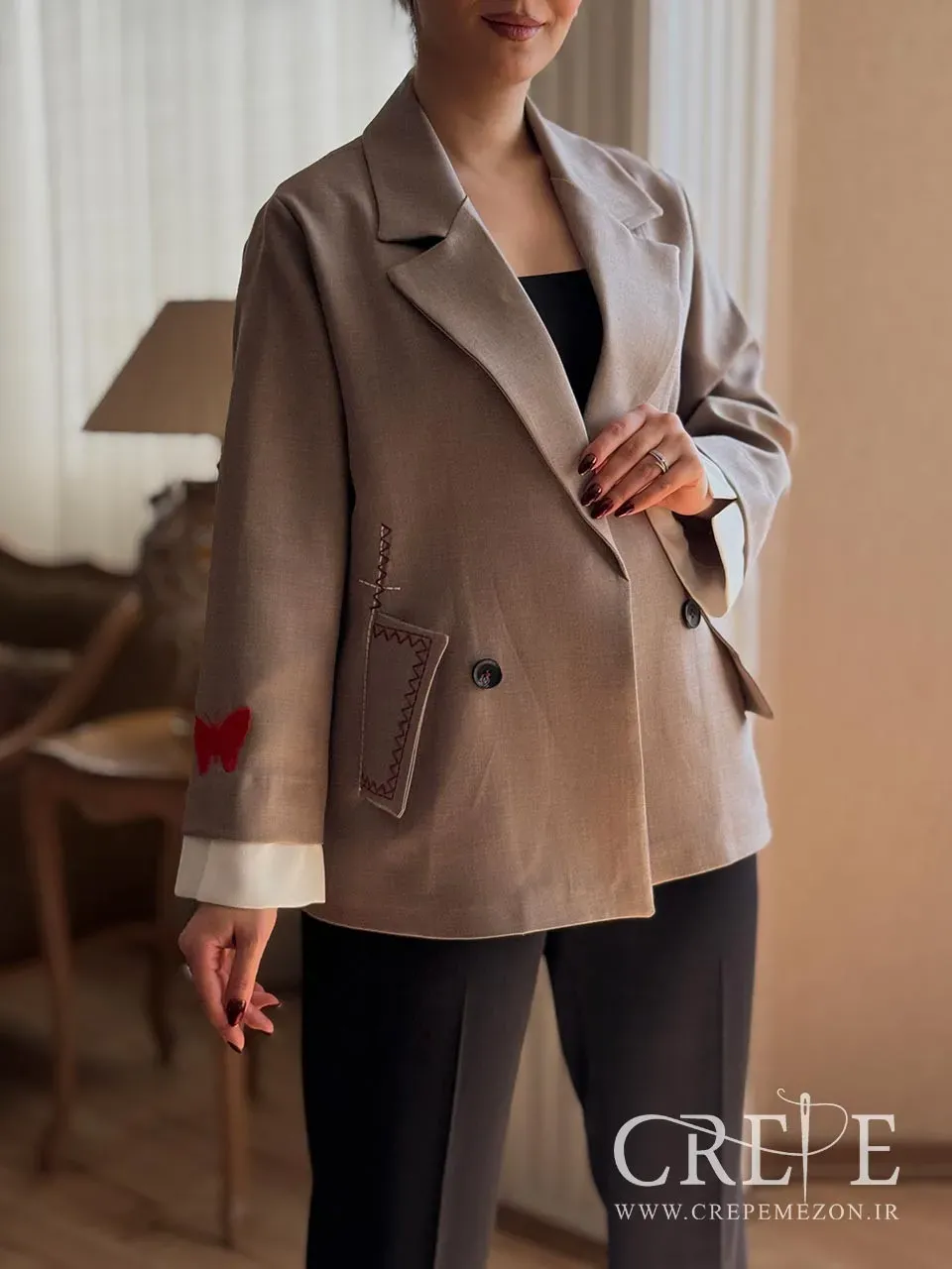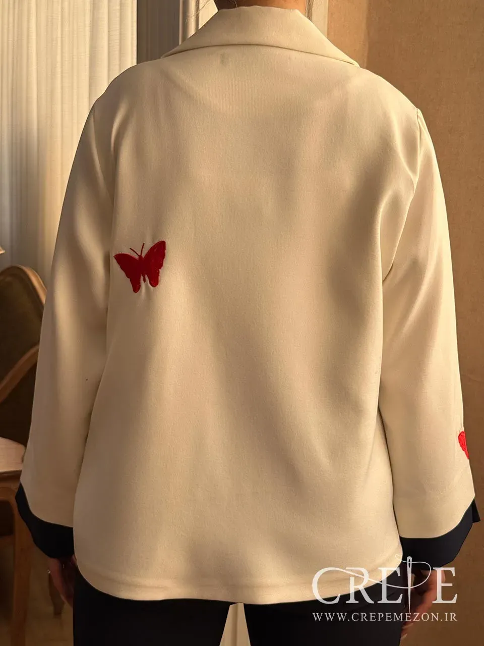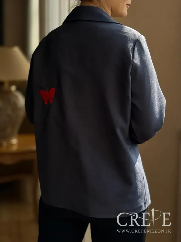 مانتو کتی پشت گلدوزی پروانه یک کت مجلسی زیباکه از جنس کتان کجراه بوده و دو طرف جلویی آن لایه کشی شده است. همچنین قابلیت استایل مجلسی و کژوال را همزمان دارد.