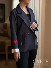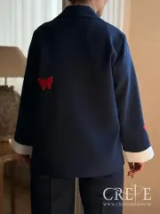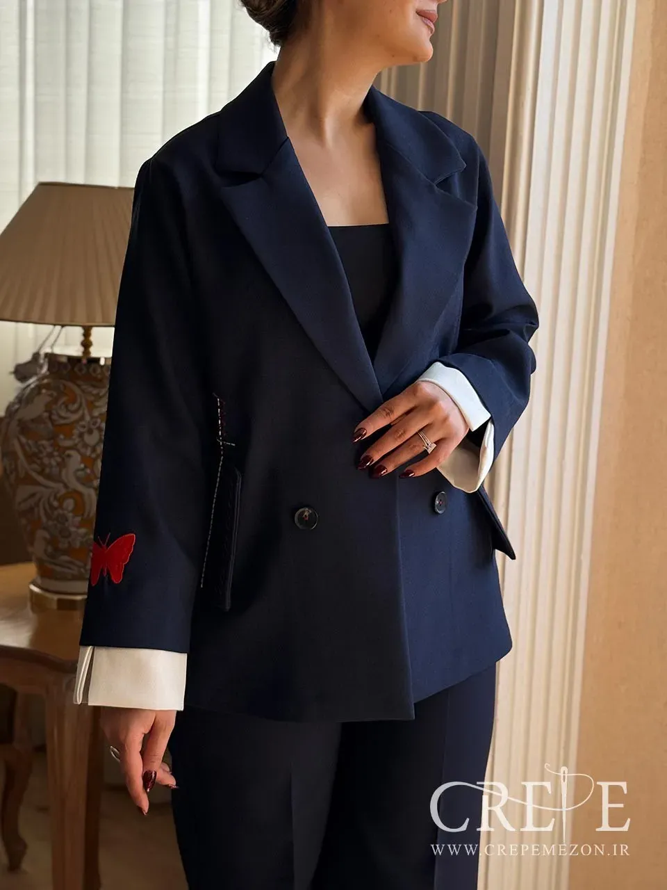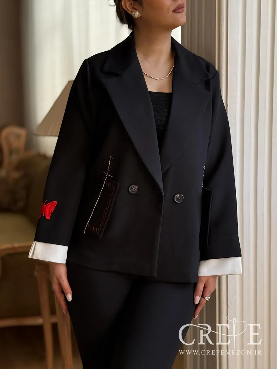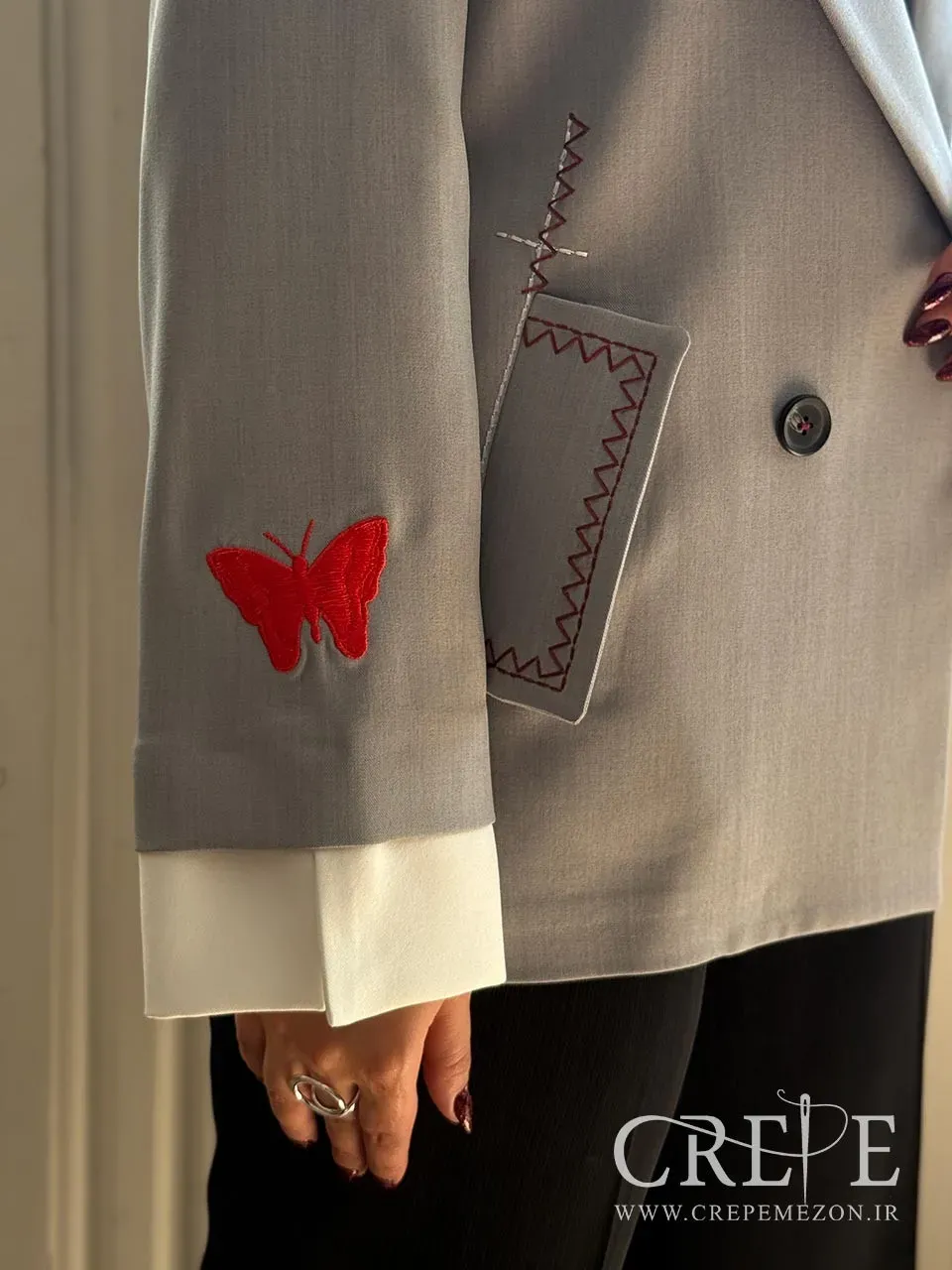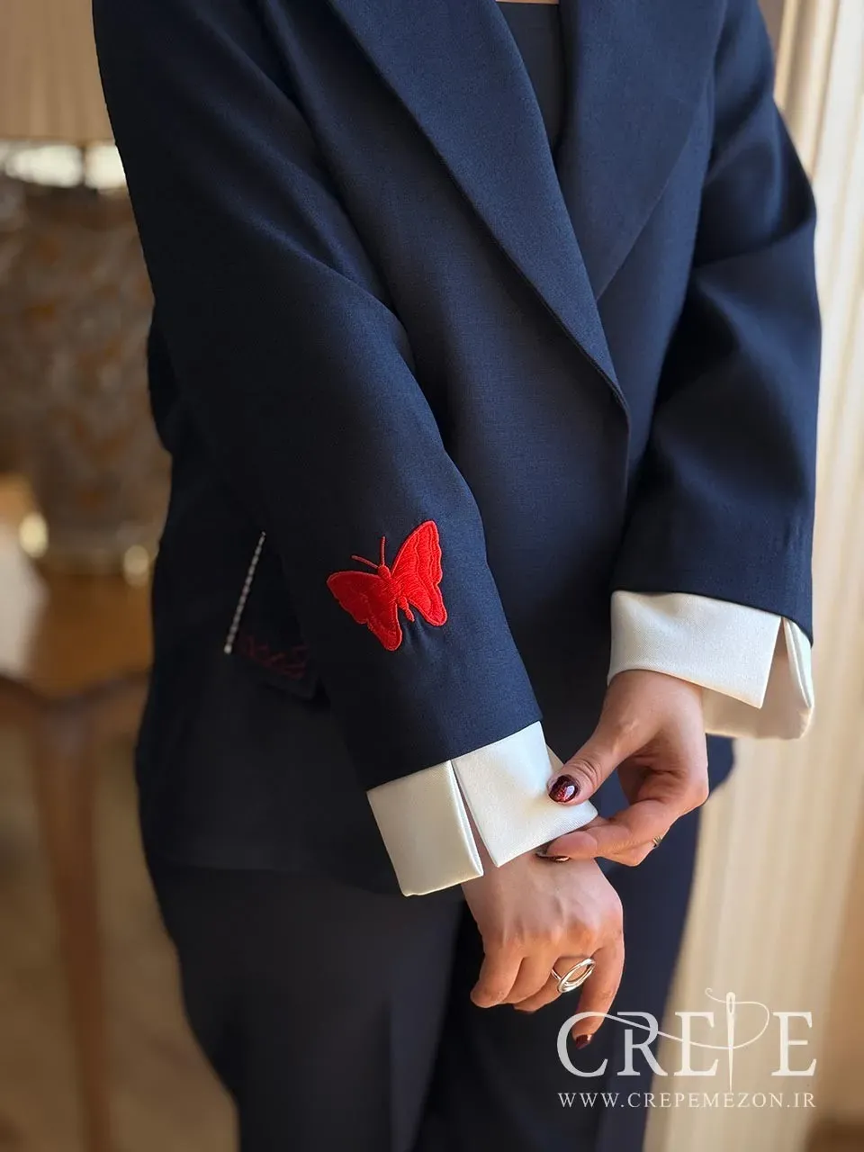 یقه انگلیسی به مانتو ظاهری کلاسیک و رسمی میدهد و مناسب برای مجالس و دورهمیها است. سر آستینها با پارچه سفید کتان کجراه طراحی شده که تضاد جالبی ایجاد کرده و به زیبایی کت میافزاید. در قسمت آستین و پشت کت، گلدوزی پروانه وجود دارد که نشاندهنده دقت در طراحی و توجه به جزئیات است. این گلدوزی میتواند جلوهای خاص و منحصربهفرد به کت ببخشد. کت دارای دو جیب کاربردی است که میتوانند به شما در نگهداری اشیاء کوچک کمک کنند و همزمان طراحی کت را تحت تاثیر قرار ندهند. این کت مجلسی میتواند گزینهای مناسب برای مهمانیها، مجالس و دورهمیها باشد.
