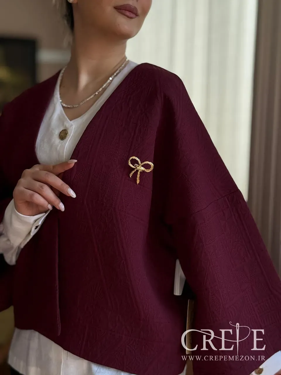 آستین های کلوش و چاکدار باعث ایجاد ظاهری خاص و متفاوت میشود و در عین حال راحتی را نیز به ارمغان میآورد. قد 59 سانتیمتری این دو تیکه ژاکارد لینن به خوبی بر روی بدن نشسته و به استایل شما فرم میدهد. سنجاق سینه طلایی به شکل پاپیون روی سینه کت، یک عنصر تزئینی زیبا و زنانه است که به سادگی جلوهای لوکس و خاص به کت میبخشد. شومیز از جنس لینن نخ تهیه شده است که باعث میشود هم سبک و خنک باشد و هم به راحتی روی بدن قرار گیرد. شومیز با طراحی جلو دکمهای، به راحتی قابل پوشیدن و درآوردن است و میتواند به عنوان یک لباس پایه برای کت استفاده شود.
