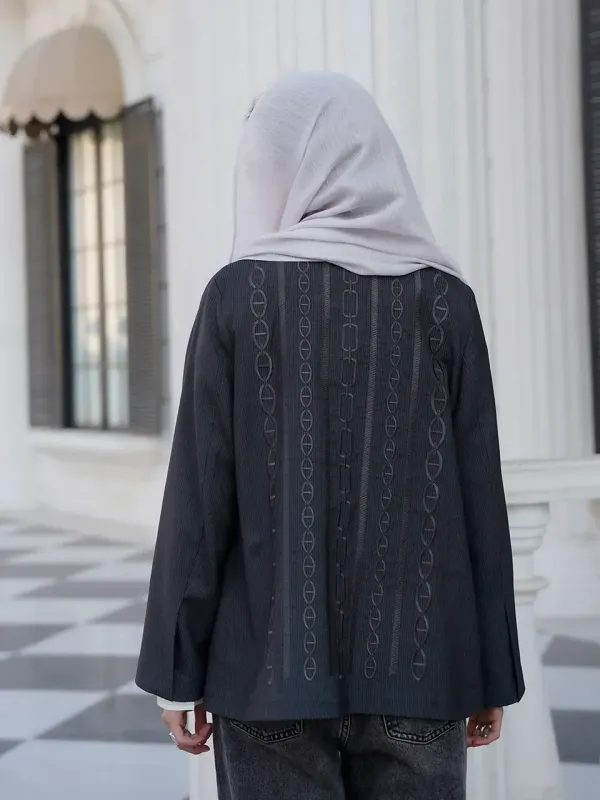 این جیبها میتوانند به عنوان یک عنصر طراحی جذاب در نظر گرفته شوند. یکی از ویژگیهای خاص این کت، گلدوزی تمام پشت آن است که طرح زنجیری را تشکیل میدهد. این طراحی هنرمندانه و خاص، کت را از سایر مدلها متمایز میکند و جلوهای خاص به آن میبخشد. این کت مجلسی گلدوزی به راحتی با انواع لباسها و اکسسوریها قابل ست کردن است و میتواند گزینهای عالی برای مهمانیها، مناسبتهای رسمی و حتی استفاده روزمره باشد. از آنجایی که دارای دوخت و برش آزاد است برای محیط کاری یا دانشگاهی نیز می تواند انتخاب شیک و چشمگیری باشد به ویژه اگر با شلوار جین و کفش کتانی استایل شود.