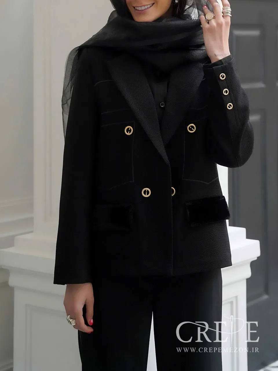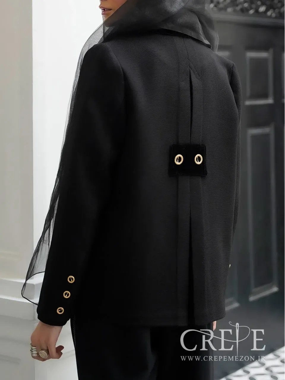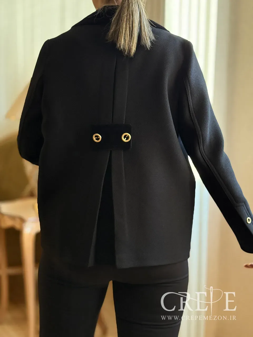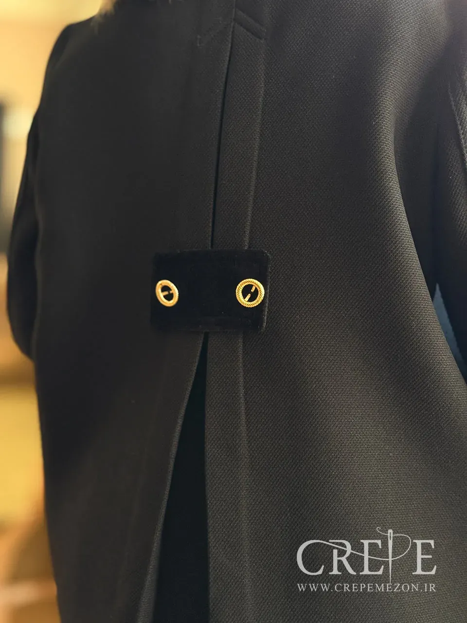 چهار دکمه طلایی در قسمت جلو وجود دارد که اگرچه کاربردی نیستند، اما به طراحی و زیبایی کت کمک کرده و جلوهای خاص به آن میبخشند. در قسمت پشت کت، پیلهای طراحی شده که به آن فرم و حجم بیشتری میدهد. این پیله به وسیله یک پل مخمل با دکمه طلایی تزیین شده که زیبایی و ظرافت بیشتری به طراحی پشت کت میبخشد. آستینها ساده و بلند هستند که این ویژگی باعث رسمیتر شدن ظاهر کت میشود و همچنین سه دکمه کوچک طلایی روی آستینها طراحی شده است که به تکمیل جزئیات و زیبایی این کت کمک میکند. به طور کلی، این کت زیبا خرید امن و ماندگاری است.