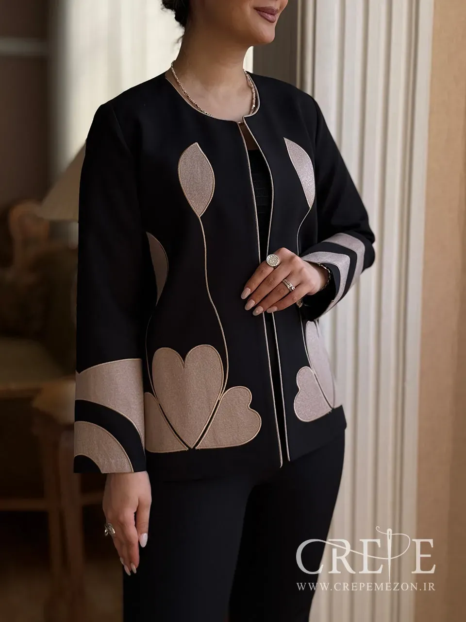 یقه گرد ساده به طراحی این مانتو زیبایی و سادگی میبخشد و آن را برای انواع فرمهای صورت مناسب میسازد. آستینهای بلند مانتو به آن ظاهری رسمی تر میدهد و در عین حال میتواند به راحتی با اکسسوری های مختلف ترکیب شود. دو طرف جلویی کت آسترکشی شده است که این ویژگی به دوام و کیفیت مانتو افزوده و همچنین راحتی بیشتری را فراهم میآورد. تکهدوزیهای انجام شده با پارچه کتان لمه، جلوهای خاص به مانتو بخشیده و طرحهای زیبای قلب و گل را به وجود آورده است. این طراحی هنری به مانتو جلوهای منحصر به فرد و جذاب میبخشد.