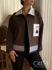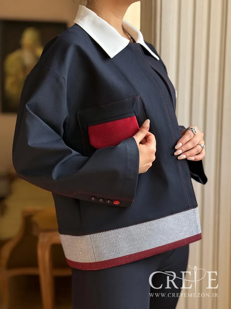 یقه مانتو قلبی به صورت مردانه طراحی شده و دارای رنگ سفید است که تضاد جذابی با رنگهای دیگر مانتو ایجاد میکند. این یقه به خوبی به فرم گردن نشسته و زیبایی بیشتری به لباس میبخشد. کت دارای یک جیب کاربردی بر روی سینه است که نه تنها جنبه زیبایی دارد بلکه میتواند برای نگهداری اشیاء کوچک مانند دستمال جیبی یا کارت ویزیت نیز مورد استفاده قرار گیرد. طراحی جلو کت به صورت باز است که به فرد آزادی حرکت بیشتری میدهد. دو طرف جلوی کت با لایه کشی شده است که به راحتی و انطباق بهتر آن با فرم بدن کمک میکند. آستینهای کت ساده و بلند هستند که ظاهری کلاسیک را به کت میبخشند.