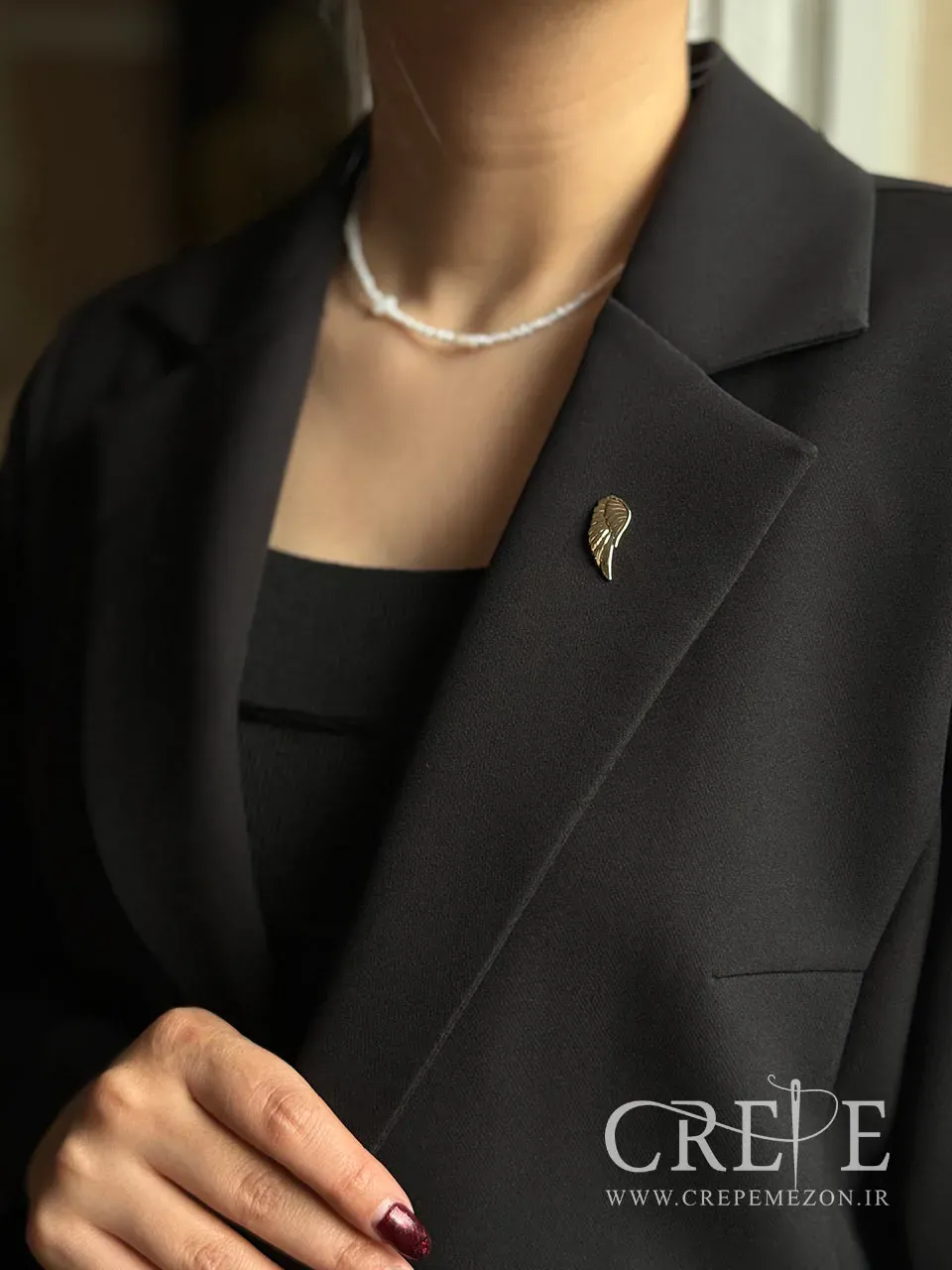 مانتو کتی یقه انگلیسی یک مانتو مجلسی که از جنس کرپ اعلا بوده و دو طرف جلویی کت لایه کشی شده است. این کت زیبا دارای گل سینه ظریف طلایی و دو جیب کاربردی است.