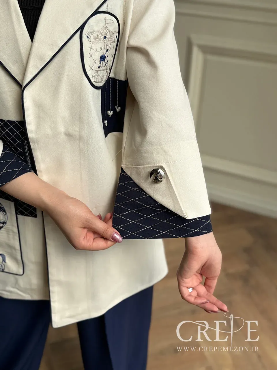 این مانتو تابستانی با توجه به طراحی، رنگبندی و جنس پارچه مناسب برای فصل تابستان می باشد. رنگ اصلی این مانتو کرم است که با جزئیات سرمهای در سرآستینها و یقه، تضاد زیبا و جذابی ایجاد کرده است. همچنین دارای یقه انگلیسی کلاسیک و سرآستینهایی به رنگ سرمهای است که ظاهری شیک و مدرن به آن بخشیده است. طراحی این مانتو به صورت جلو باز است که امکان راحتی در پوشیدن و درآوردن را فراهم میکند و استایل آزاد و راحتتری دارد. یک جیب کاربردی در کنار آن قرار دارد که علاوه بر زیبایی، امکان نگهداری اشیاء کوچک مانند گوشی یا کلید را فراهم میکند.