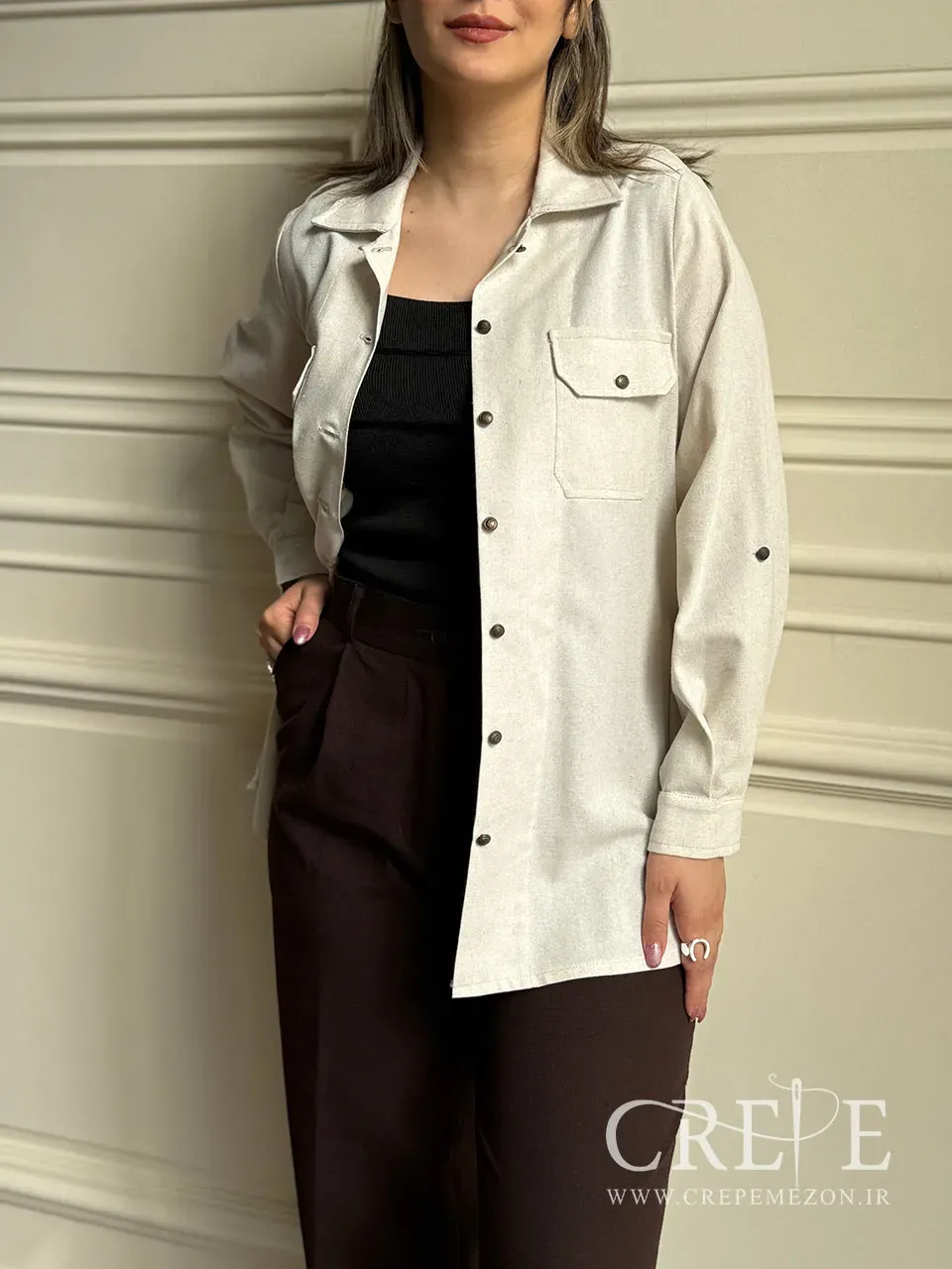 دارای آستینهای بلند با مچهای منظم است که ظاهری شیک و مرتب به آن میبخشد. همچنین، دو جیب روی سینه دارد که علاوه بر جنبه کاربردی، به زیبایی کلی لباس افزوده است. قسمت جلویی این شومیز با دکمههای ساده و زیبا طراحی شده است که امکان بسته بودن کامل یا نیمهباز آن را فراهم میکند، و به استایلهای مختلف امکان میدهد تنوع ایجاد کنید. قد نسبتا بلند این شومیز، آن را برای استفاده به عنوان مانتو یا روی لباسهای دیگر مناسب میسازد و قابلیت ست شدن با انواع دامن و شلوار را داراست.