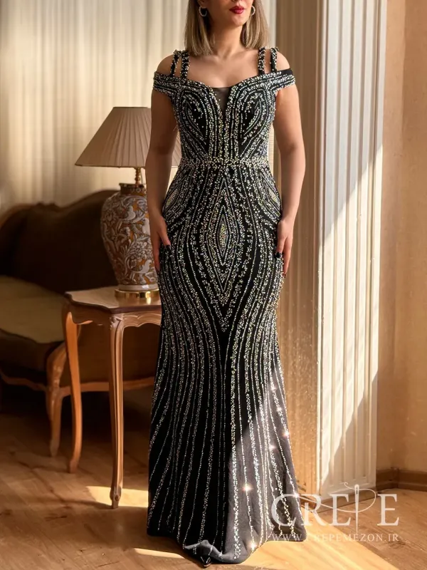 تزئینات بینظیر روی این ماکسی شامل جواهرات یا نگینهای ریز براق هستند که با الگوهای هندسی منظم بر روی تمام سطح لباس کار شدهاند. این الگوها از بالای سینه شروع میشوند، دور کمر متمرکزتر هستند و سپس به سمت پایین لباس پراکندهتر میشوند. ترکیب مناسب رنگ مشکی پایه با براقیت نگینها تضاد زیبایی ایجاد کرده و باعث برجسته شدن خطوط بدن فردی میشود که این لباس مروارید دوزی را پوشیده است. همچنین لازم به ذکر است که استفاده از کمربندی ظریف در کمر باعث ایجاد توازن بین بالا تنه و پایین تنه میشود اما از آنجایی که خود پیراهن با مروارید دوزی هایی که دارد دور کمر را به زیبایی مشخص کرده است احتیاجی به استفاده از کمربند نیست.