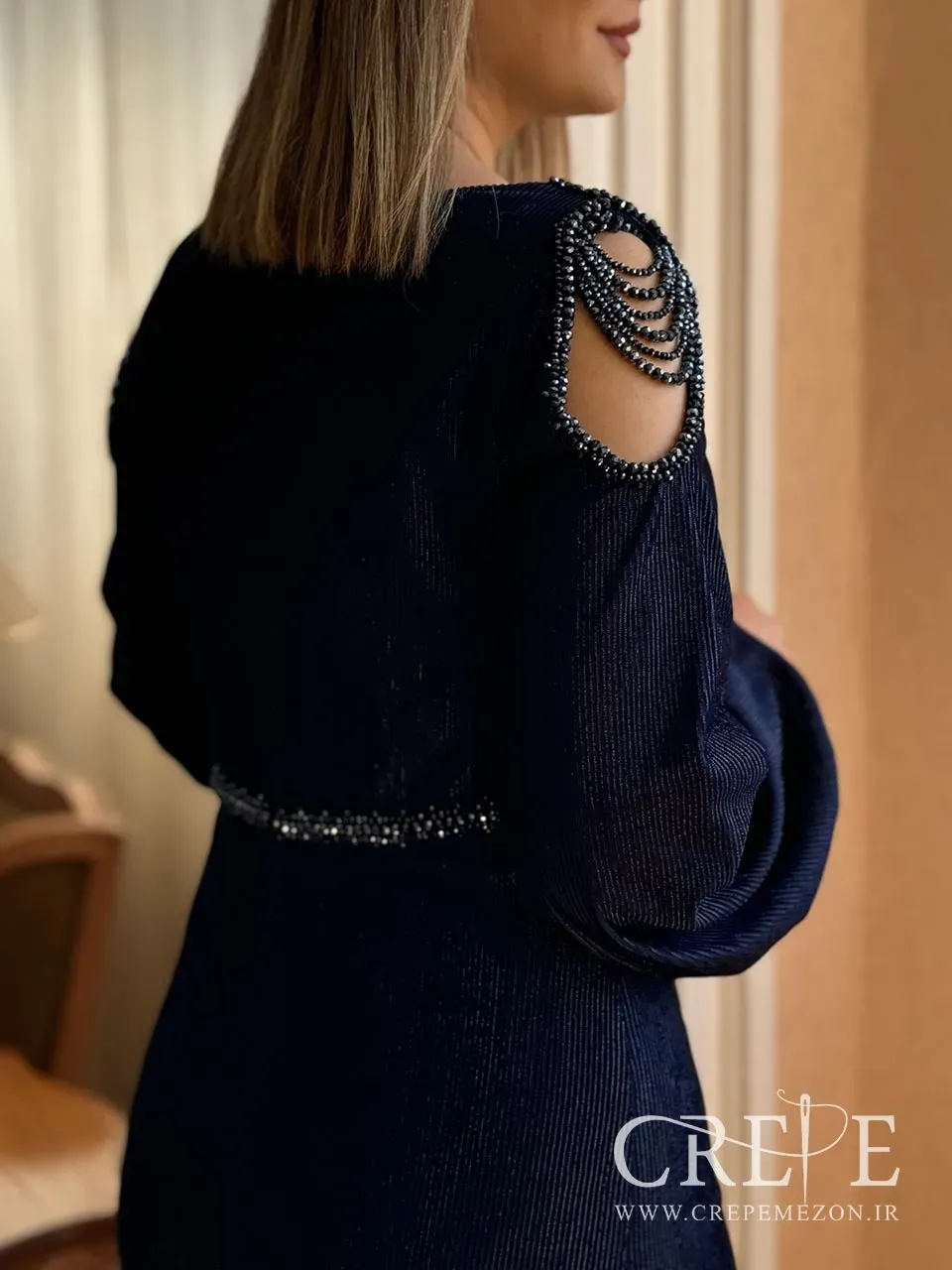 این پیراهن مجلسی از جنس پارچه پرطرفدار و سبک لمه می باشد که یقه آن به شکل گرد و باز طراحی شده و با تزئیناتی از مروارید یا سنگهای براق تزیین شده است. آستینهای لباس بلند و نسبتا گشاد هستند، همچنین قسمتی از شانهها باز مانده که با استفاده از همان تزئینات یقه، زیبایی بیشتری گرفته و کار از سادگی کامل خارج شده است. قسمت کمر پیراهن نیز دارای تزیینات مشابهی است که باعث میشود لباس فرم بسیار شیکتری پیدا کند. پایین دامن لباس ساده و تا حدی چیندار بوده که به زیبایی آن افزوده است و هنگام راه رفتن فرم دلبرانه ای پیدا می کند. به طور کلی این مدل پیراهن مناسب مناسبتهای رسمی مانند مراسم شبانه یا مهمانیهای خاص میباشد.