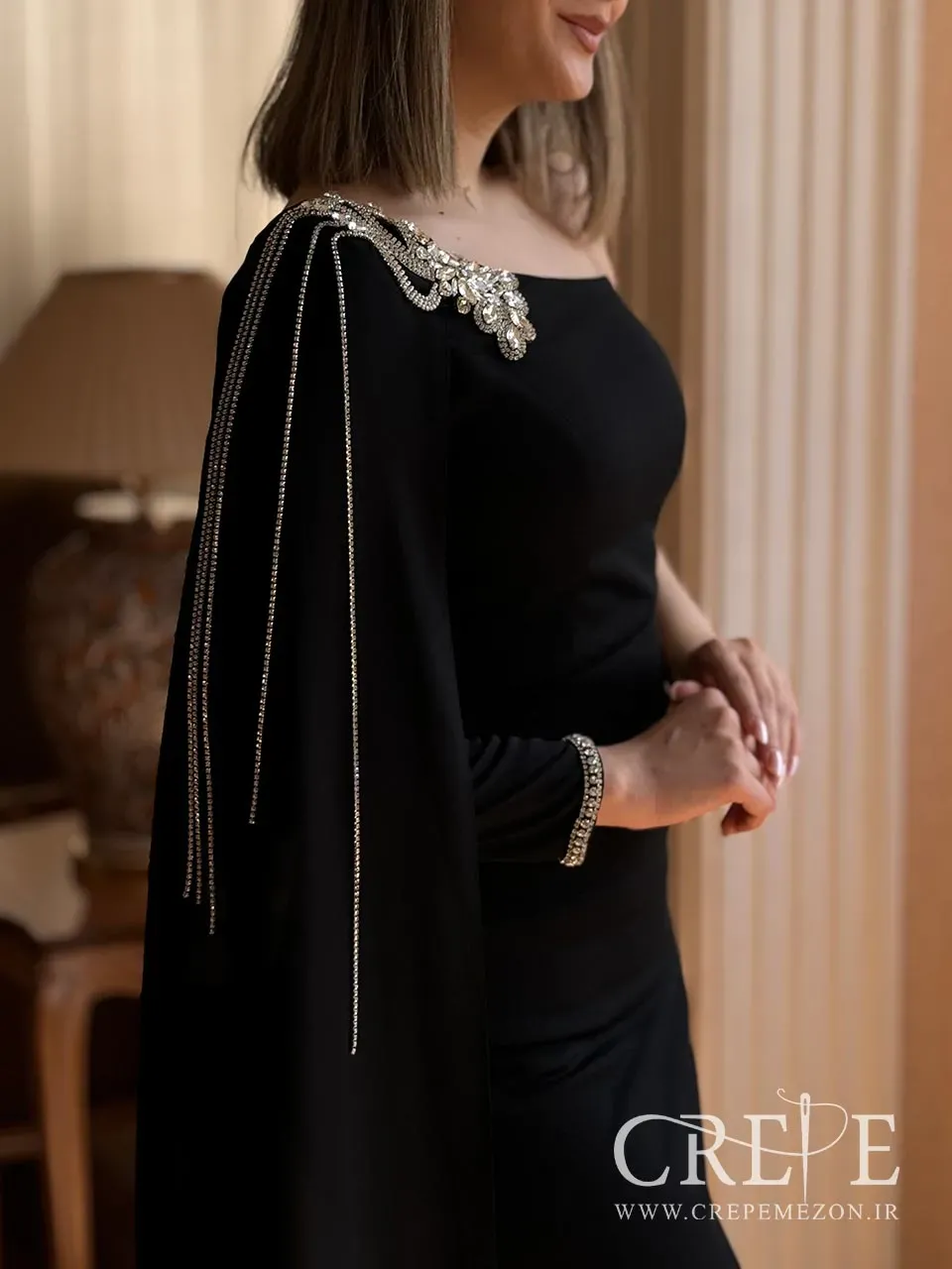 این لباس مجلسی یک پیراهن مشکی بلند و مجلسی است که طراحی آن به صورت تکشانه (وان-شولدر) با پوشش جزئی شانه دیگر انجام شده است. در قسمت شانه تزئینات برجستهای دیده میشود که به لباس جلوهای زیبا و شیک بخشیده. همچنین، از یک شال یا اصطلاحا شنل بلند همراه با این پیراهن استفاده شده که از زیر تزئینات شانه آویزان است و حس لوکس بودن را تقویت میکند. همانطور که می دانید رنگ مشکی از جمله رنگ های کاربردی است که برای همه مناسبت ها میتواند قابل استفاده باشد و از آنجایی که طراحی آن مینیمال و کم حزییات است اگر از پارچه به درستی مراقبت شود تا مدت های طولانی قابل استفاده بوده و به زیبایی ورز اول در تن خواهد درخشید.