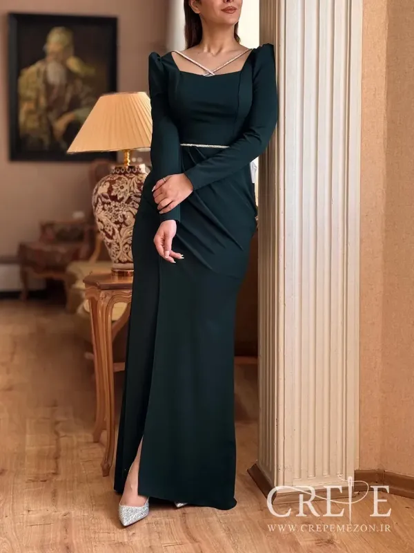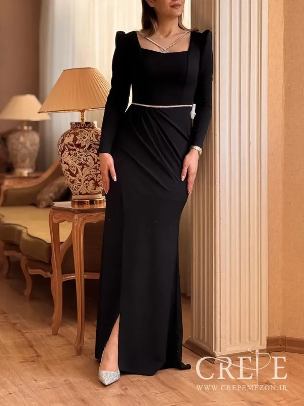 یک ریسه نگینی دیگر نیز دور کمر ماکسی قرار دارد که به تنگی و زیبایی فرم کمر کمک میکند و به تناسب اندام تأکید میکند. در قسمت شکم، چندین پیله طراحی شده است که به پیراهن حجم و زیبایی میبخشند و همچنین به راحتی حرکت کمک میکنند. همانطور که می دانید پیله ها باعث خطای دید شده و بزرگی شکم را پنهان می سازد. سرشانه های پیراهن کمی پف دارند که این ویژگی به طراحی خاص و مدرن آن کمک میکند و ظاهری زنانه و جذاب به آن میدهد. آستینهای این پیراهن بلند و مناسب هستند که به زیبایی و پوشیدگی آن افزوده است. پایین دامن دارای چاک بلندی است که به دلیل طراحی دو لایه، پاها چندان مشاهده نمیشوند.