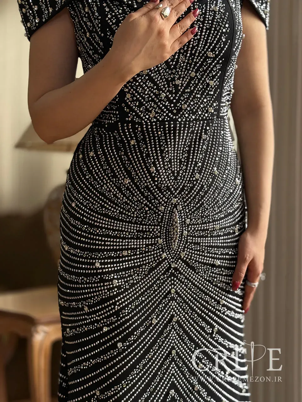 ماکسی یقه دلبری نگینی یک پیراهن مجلسی زیبا که از جنس کرپ دالقیچ بوده و با نگین دوزی به یک شاهکار در میان لباس های مجلسی تبدیل شده است. خرید اقساطی نیز دارد.