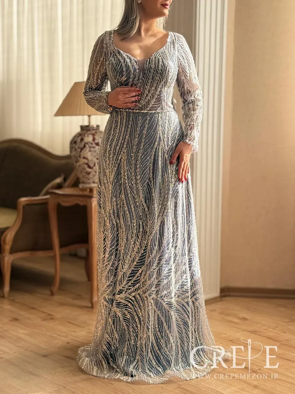 پیراهن مجلسی دامن کلوش یک ماکسی وارداتی فاخر که پارچه آن تور کار شده است و زیر نور درخشش چشمگیری پیدا می کند. این پیراهن مجلسی دارای کاپ و آستر نیز می باشد.
