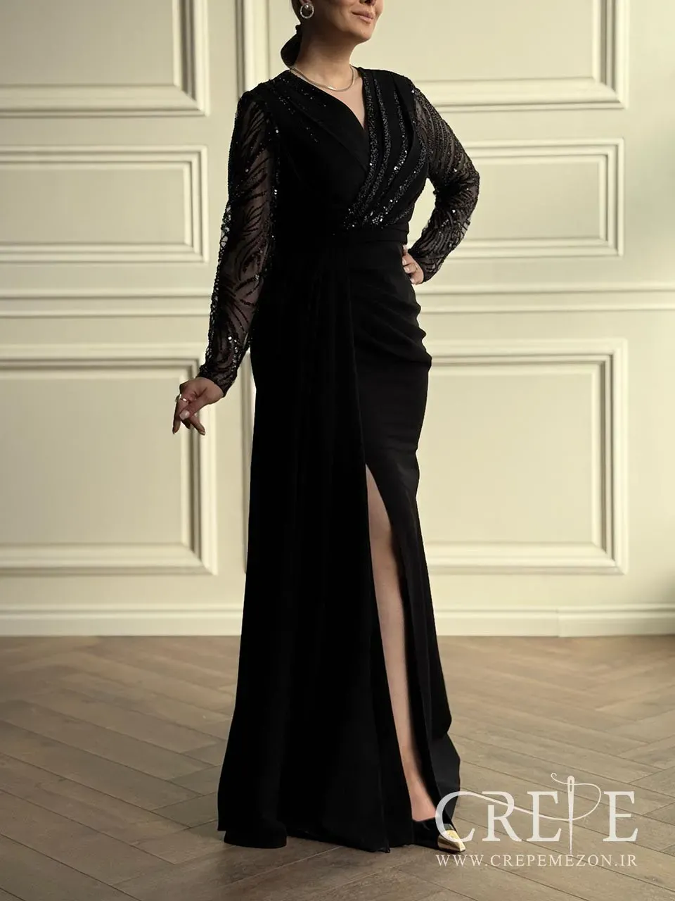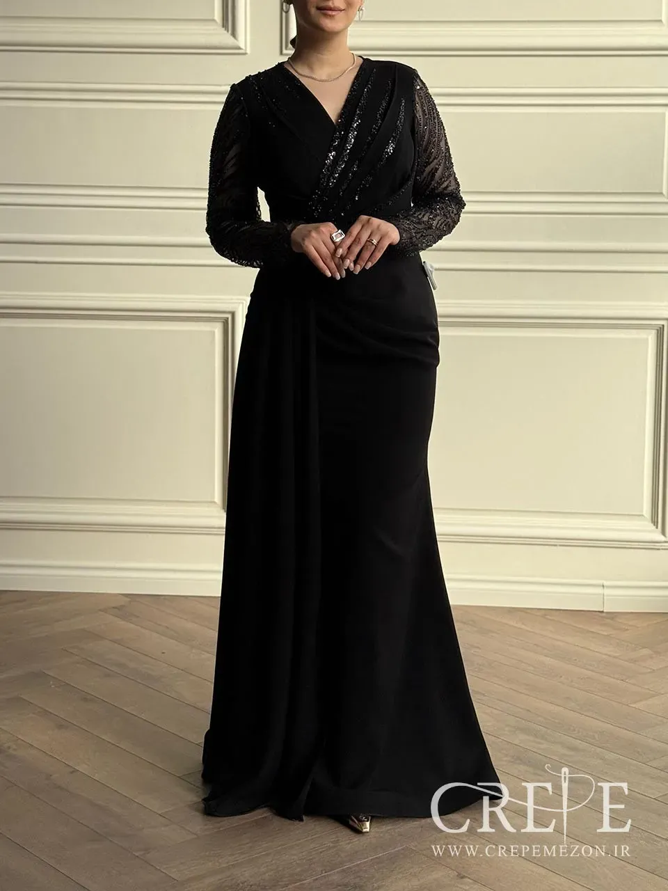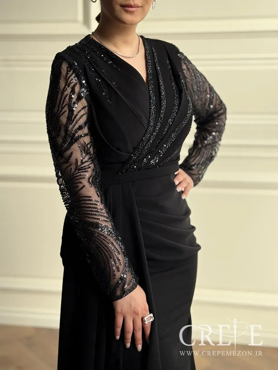 آستینهای تور پولکی این پیراهن مجلسی که با بافتی شفاف و درخشان، به لباس لمسی خاص و مدرن میبخشد و ظاهری مجلل و جذاب دارد. این پیراهن مناسب برای مهمانیهای رسمی، مجالس شب، عروسیها و رویدادهای خاص است که نیازمند لباس مجلسی شیک و متفاوت است. در مجموع، پیراهن ماکسی کرپ کنزو ترکیبی عالی از طراحی مدرن، جزئیات خاص و مواد باکیفیت است که هر فردی را در مجالس و رویدادهای خاص متمایز میکند.