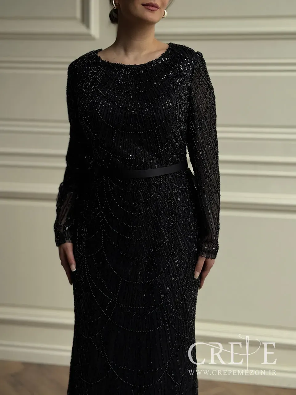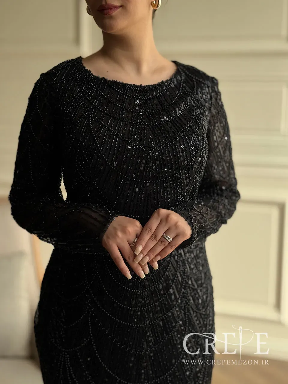 این پیراهن مجلسی تمام پنل با برشهای اندامی است، بنابراین میتوانید آن را با کیف و کفش ساده و بدون طرح و رنگ های ساده ترکیب کنید تا تمرکز بر روی پیراهن باقی بماند.