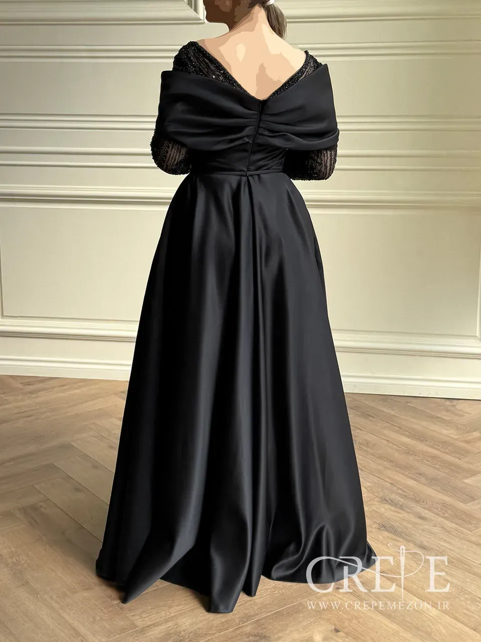 قسمت بالاتنه پیراهن با سنگ های تزئینی کار شده است، که با طراحی دقیق و هنرمندانه، جلوه ای درخشان و مجلل به پیراهن می بخشد. آستین های دراپه، که روی بازوها قرار میگیرند و ظاهری آزاد و در عین حال شیک دارند. این نوع آستینها حس راحتی و ظرافت را در پیراهن ایجاد میکنند. قسمت پشتی دارای فرم مشابه پاپیون است، که به طراحی ظریف و خاص پیراهن افزوده است. در قسمت جلوی پیراهن یک چاک وجود دارد که به آن حرکت و راحتی در هنگام راه رفتن و ایستادن میدهد، همچنین ظاهری جذاب ایجاد میکند.