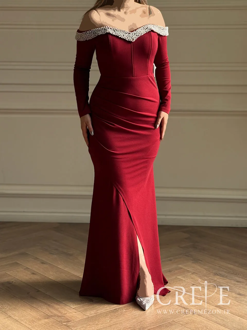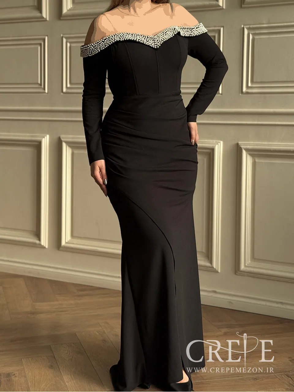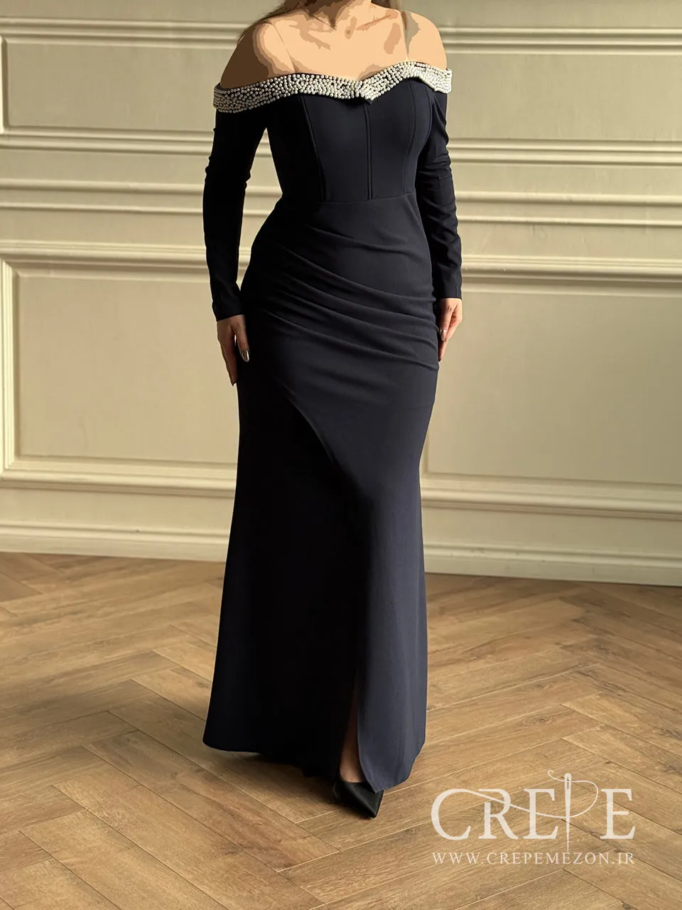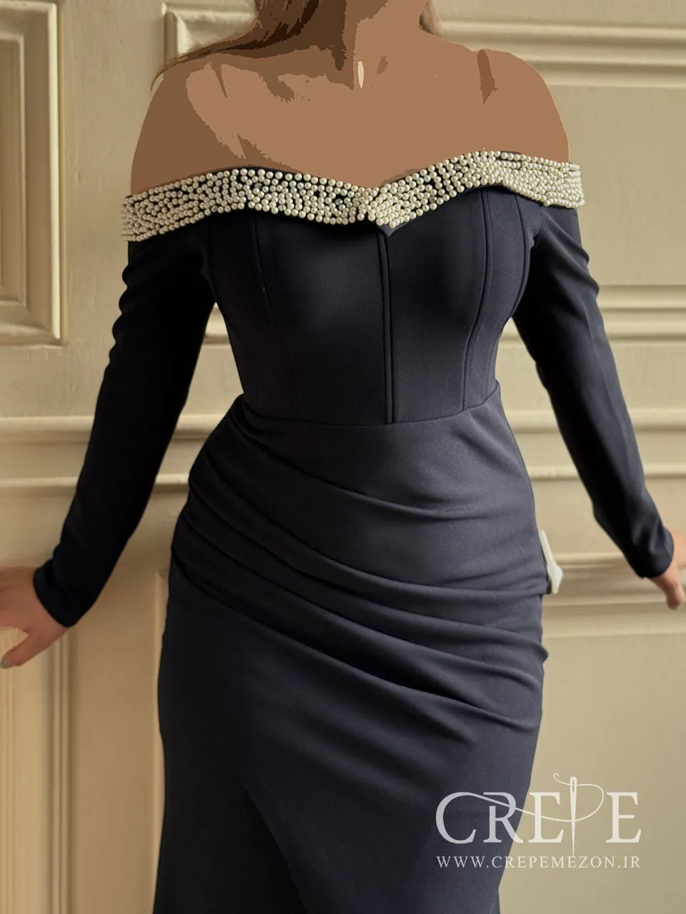 ماکسی یقه مرواریدی دالقیچ یک پیراهن مجلسی که از جنس کرپ دالقیچ بوده و دارای کاپ و آستر می باشد. مرواریدهای دور یقه با رنگ پیراهن در تضاد جذابی قرار دارد.