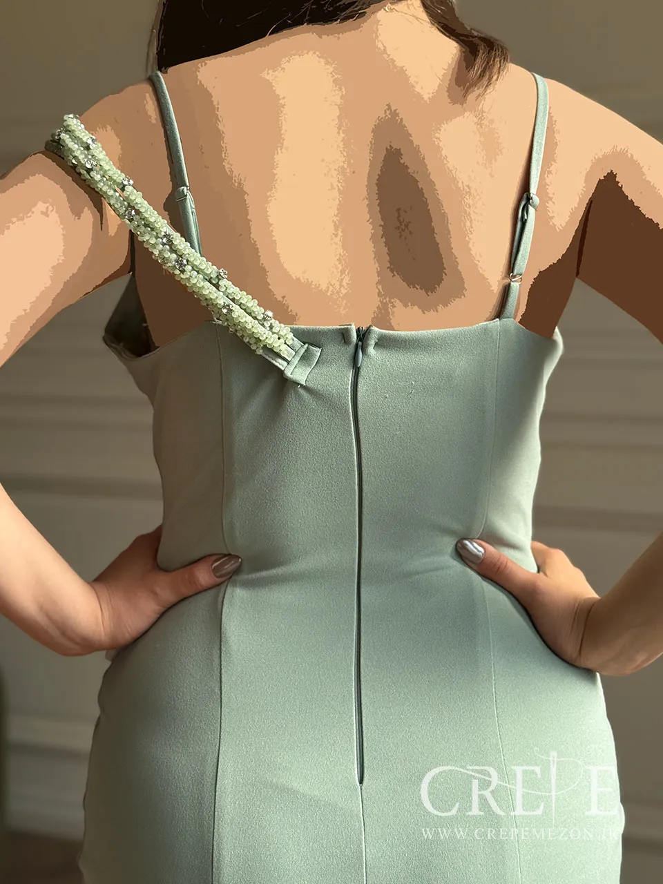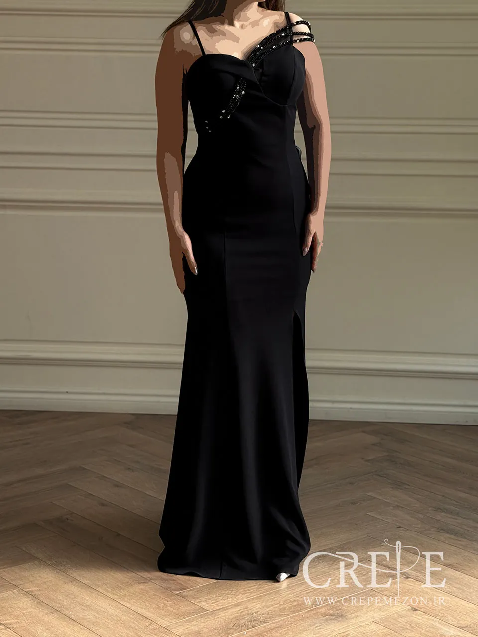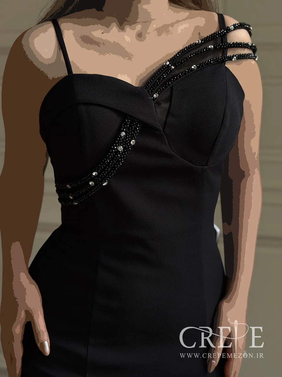 ماکسی دکلته سه فنر یک پیراهن مجلسی که از جنس کرپ دالقیچ بوده و دارای کاپ و آستر می باشد. این پیراهن با طراحی اندامی و نگین های درخشان جلوه شیکی در تن دارد.
