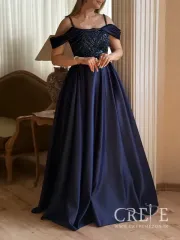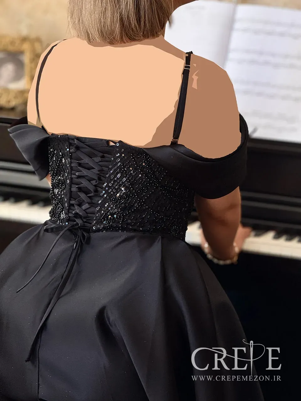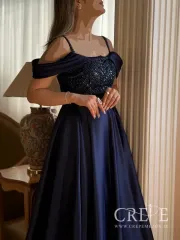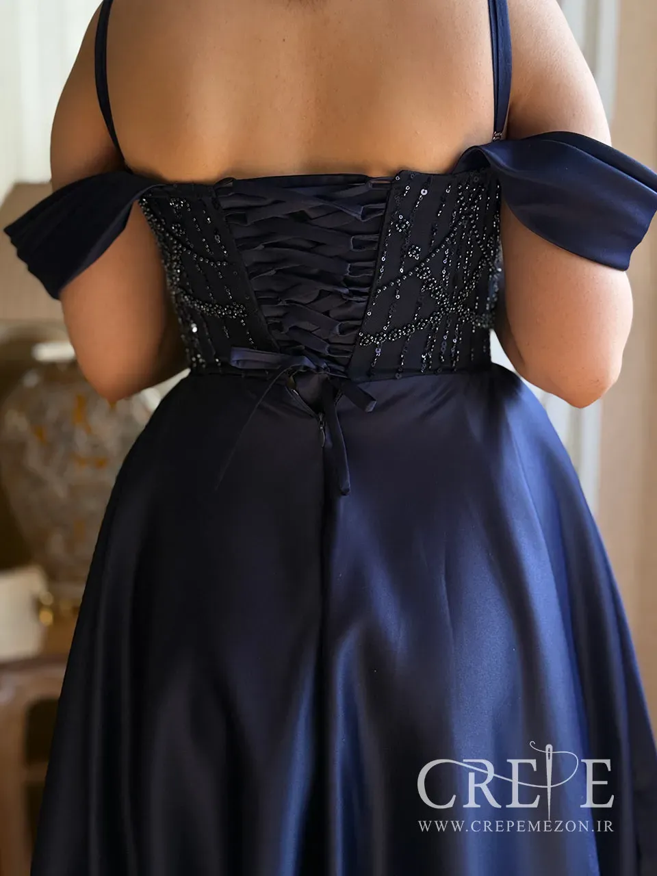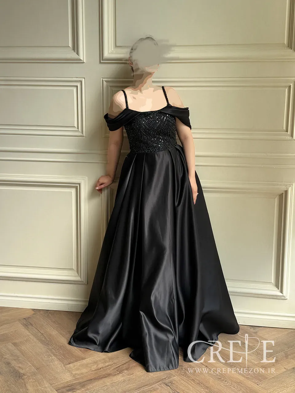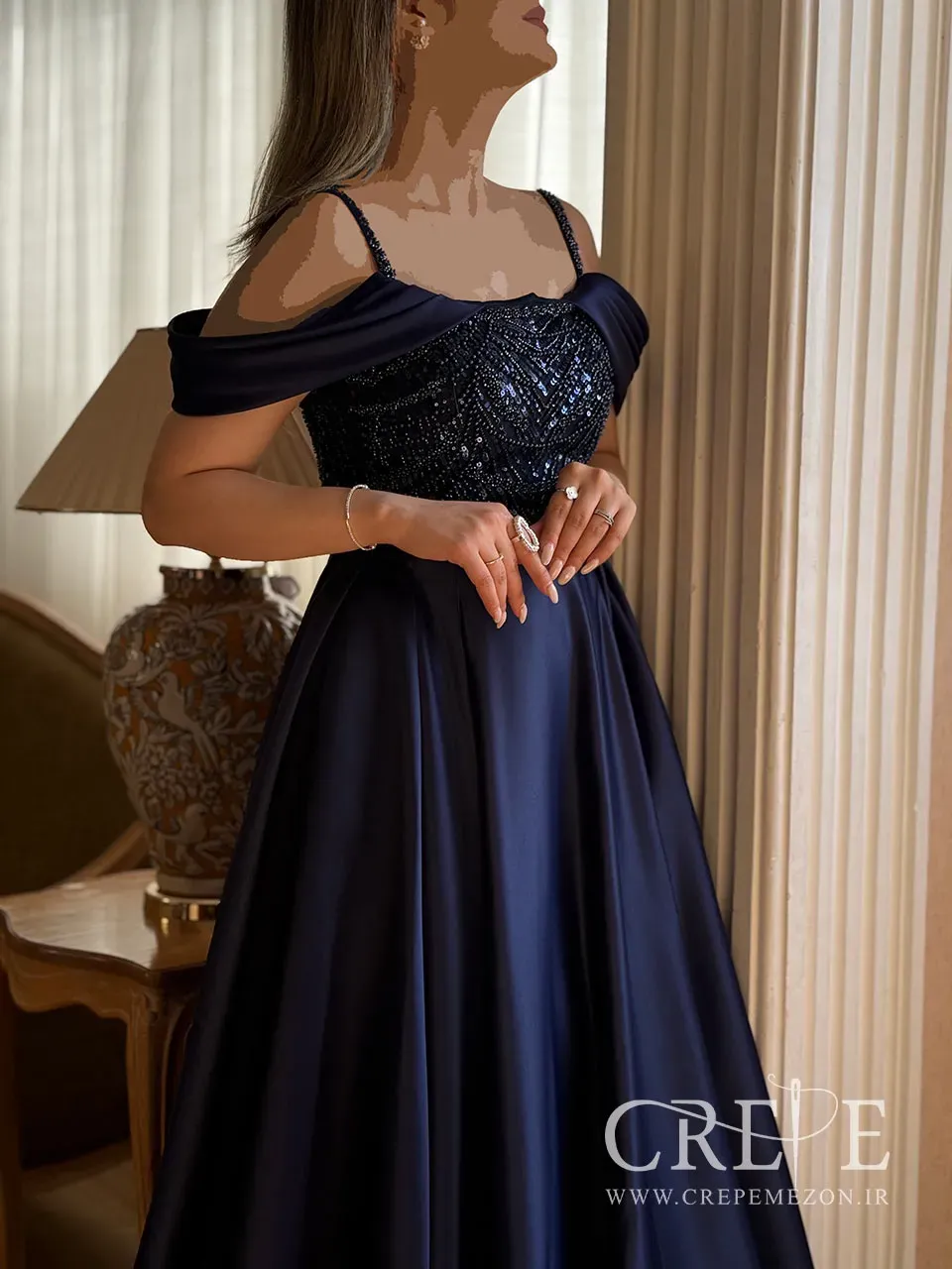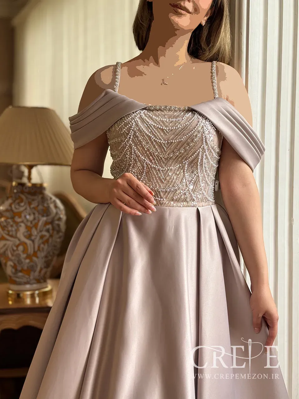 بالاتنهی پیراهن با تزییناتی از نوع نگینها، مرواریدها یا سنگهای براق پوشیده شده است که درخششی خیرهکننده به ظاهر کلی لباس اضافه میکند. این تزیینات به شکل الگوهای پیچیدهای روی پارچه کار شدهاند تا زیبایی بیشتری به پیراهن مجلسی رویا ببخشند. یکی از ویژگیهای منحصر به فرد این پیراهن، بندهای نازک اسپگتی است که بر روی شانهها قرار گرفتهاند و با همان تزیینات براق هماهنگ هستند. این بندها ظاهری لطیف و زنانه به لباس داده و علاوه بر آن وظیفه نگهداری از لباس را نیز برعهده دارند.
