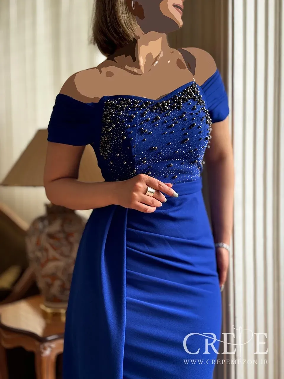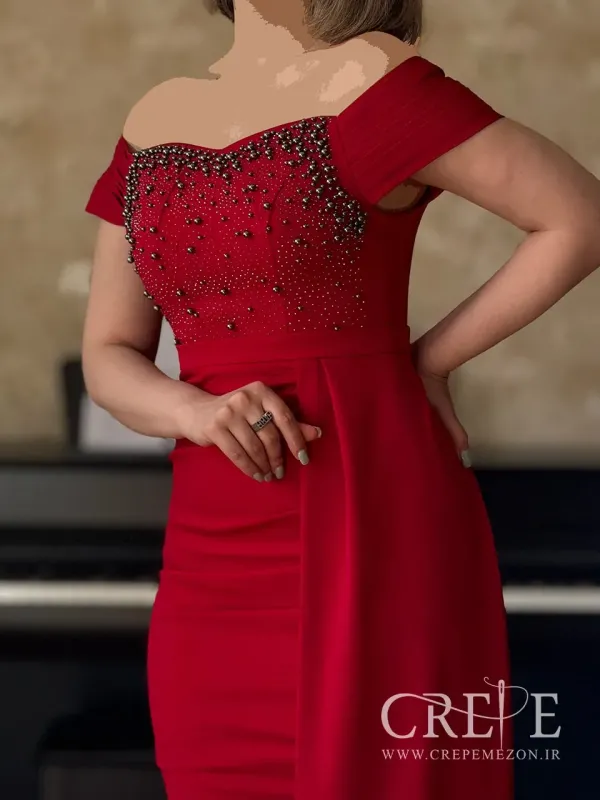 بخش سینه این ماکسی دالقیچ نگین پانچی با سنگها و مرواریدهای کوچک تزئین شده است. این تزئینات به شکل پراکنده روی بخش سینه قرار گرفتهاند و درخشش خاصی به آن میبخشند. یقهی لباس، قلبی شکل (Sweetheart) بوده که جذابیت بیشتری به طراحی آن افزوده است. همچنین قسمت بالای یقه با نوارهای افقی مزین شده که روی شانهها را نیز پوشش میدهند. آستینهای این پیراهن مجلسی کوتاه و افتاده هستند، یعنی کمی پایینتر از شانه قرار گرفتهاند که نمای زیبا و متفاوتی ایجاد کردهاند. بدنهی اصلی پیراهن از جنس پارچهای کشسان به نام کرپ دالقیچ دوخته شده که باعث فیت شدن عالی در بدن میشود.