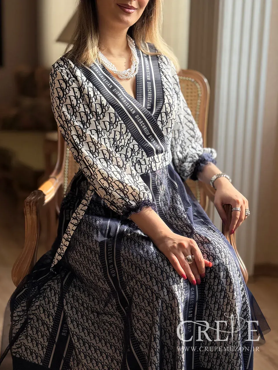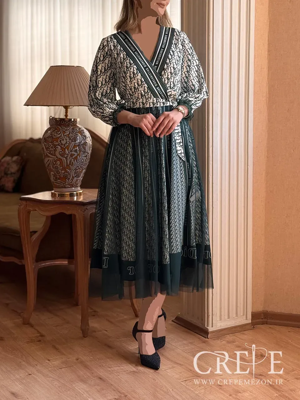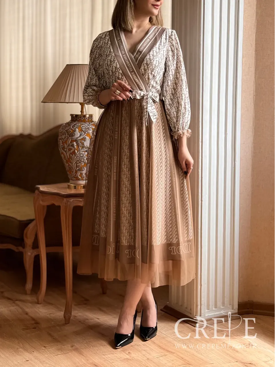 این پیراهن زیبا با طراحی شیک و خاصی که دارد، از جنس پارچهای نرم و لطیف به نام کرپ الیزه دوخته شده است. رنگ اصلی این پیراهن بژ یا کرم است که جلوهای کلاسیک و دلنشین به آن میبخشدف همچنین در حال حاضر یشمی و مشکی نیز از آن موجود است. قسمت بالاتنه پیراهن دارای الگوی چاپی مونوگرام قهوهای است که بر روی زمینه بژ قرار گرفته. طراحی یقه به شکل هفت (V) یا چپ و راستی است که با حاشیههای نوار دوزی شده مشکی تزیین شده است. نوار دوزیها در قسمت یقه تا پایین ادامه دارند و همچنین در قسمت کمر نیز دیده میشوند. این طراحی باعث متمایز شدن یقه و همچنین دامن شده است که در کنار اینکه هارمونی جذابی ایجاد کرده از لحاظ ترکیب طرح نیز یکپارچه و یکدست شده است.