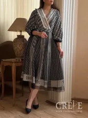 آستینها سهربعاند، یعنی تا زیر آرنج امتداد دارند. انتهای آستینها با کش چین دوزی ظریفی تزیین شدهاند که حالتی پرنسسی به لباس بخشیدهاند. دامن این پیراهن پیله دار بوده و از همان الگوی چاپی در قسمت پایین تنه نیز استفاده شده است اما طرح آن کمی متفاوتتر و پراکندهتر از بالاتنه میباشد. همچنین لبه پایینی دامن دارای حاشیهای پهنتر بوده که به زیبایی هر چه بیشتر لباس افزوده است. در مجموع، این پیراهن مجلسی چپ و راستی ترکیبی از شیک بودن کلاسیک با جزئیات مدرن را ارائه میدهد، مناسب برای مراسم های مختلف مانند مهمانیهای رسمی یا نیمهرسمی میباشد. همچنین برای دورهمی ها و حضور در باغ یا کنسرت ها نیز انتخاب ایده آلی خواهد بود.