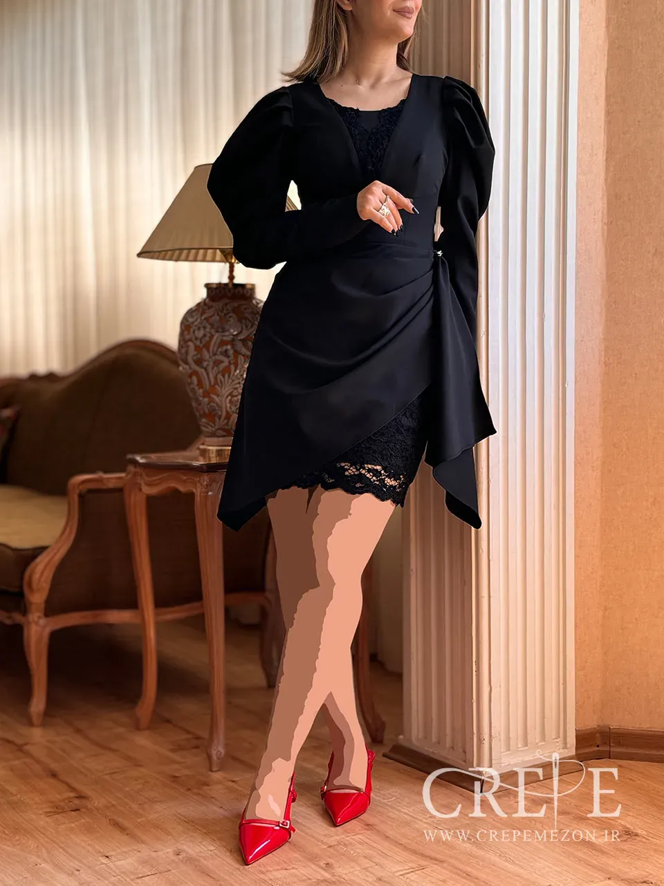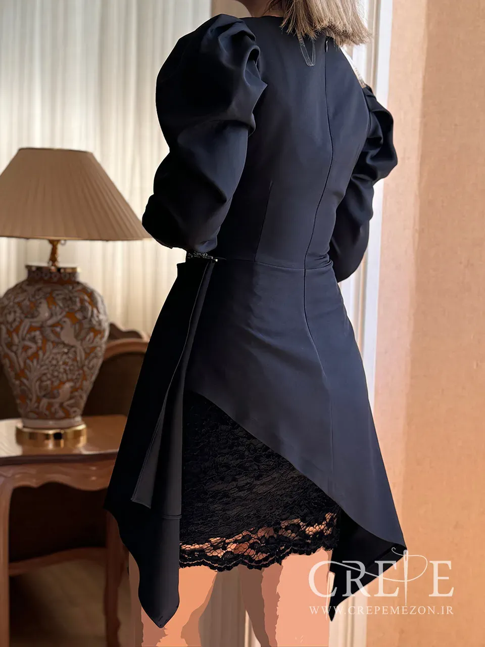 پیراهن کوتاه سرشانه پفی یک لباس مجلسی زیبا و عروسکی که حتی قابلیت تبدیل شدن به یک لباس پوشیده را نیز دارد. ترکیب گیپور و کرپ همیشه باعث جذابیت لباسها میشود.