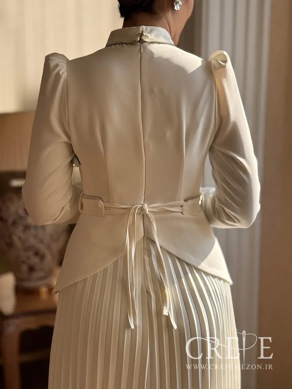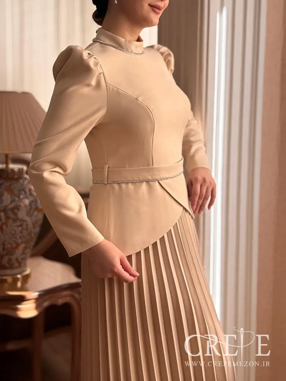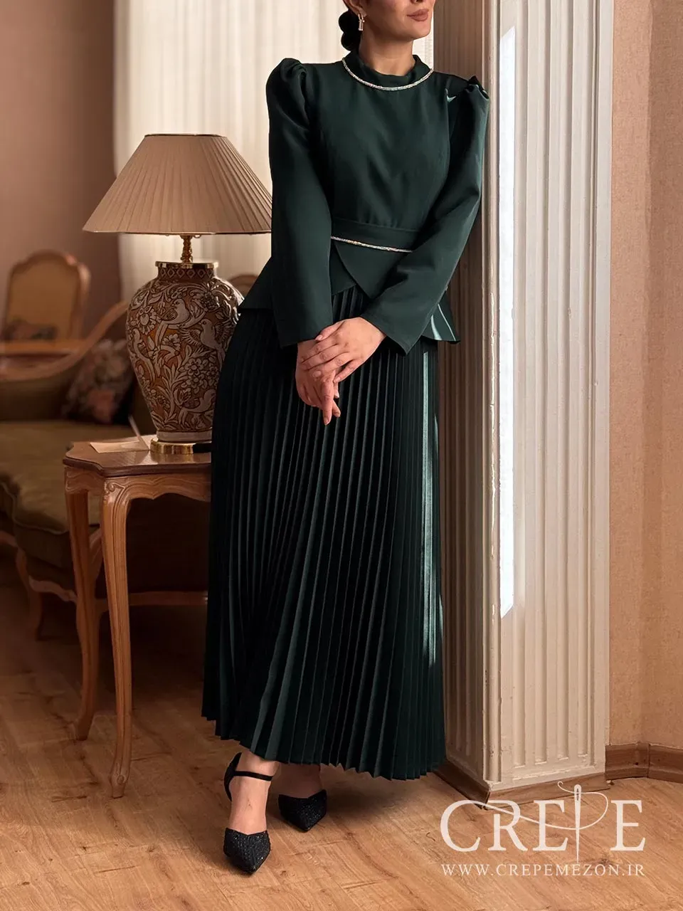 پیراهن میدی بالاتنه نواردوزی یک لباس پوشیده بلند و جذاب که در رنگ کرم، یشمی و مشکی طراحی شده است. یقهای بسته با جزئیات ظریف دارد که جلوهای شیک به پیراهن میبخشد. آستینها بلند هستند و در سرشانهها کمی پف دارند که به لباس حجم و شکلی خاص میدهد. بالاتنهی پیراهن ساده و بدون جزئیات اضافی است، اما این سادگی باعث نمیشود که از شیکی آن کاسته شود. دامن این پیراهن پلیسهدار است که به آن حالتی مجلل و فاخر میدهد. پلیسههای مرتب دامن، حرکت زیبایی ایجاد کرده و ظاهر کلی را بسیار دلنشین میکنند. همچنین پلیسه ها همیشه ترند و محبوب اند و بدون نیاز به تلاش خاصی شما را آراسته و مرتب می سازد. پلیسه ها از جمله طراحی هایی است که به گفته متخصصان مد هرگز قدیمی نمی شود و همیشه طرفداران خاص خودش را دارد.