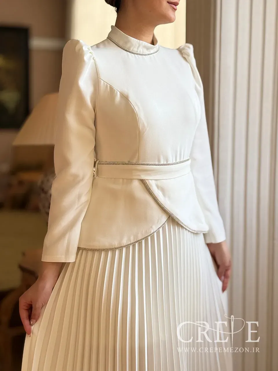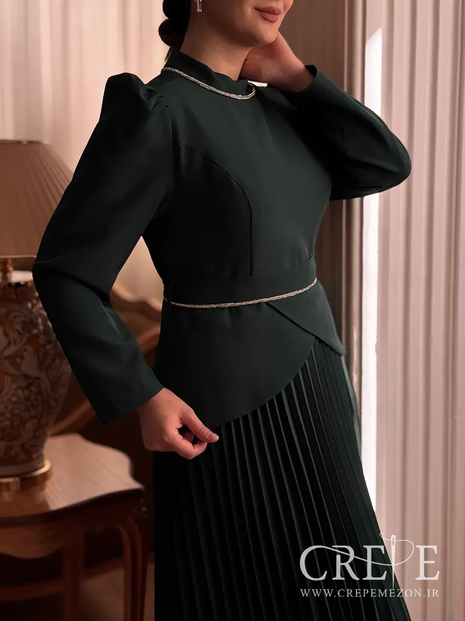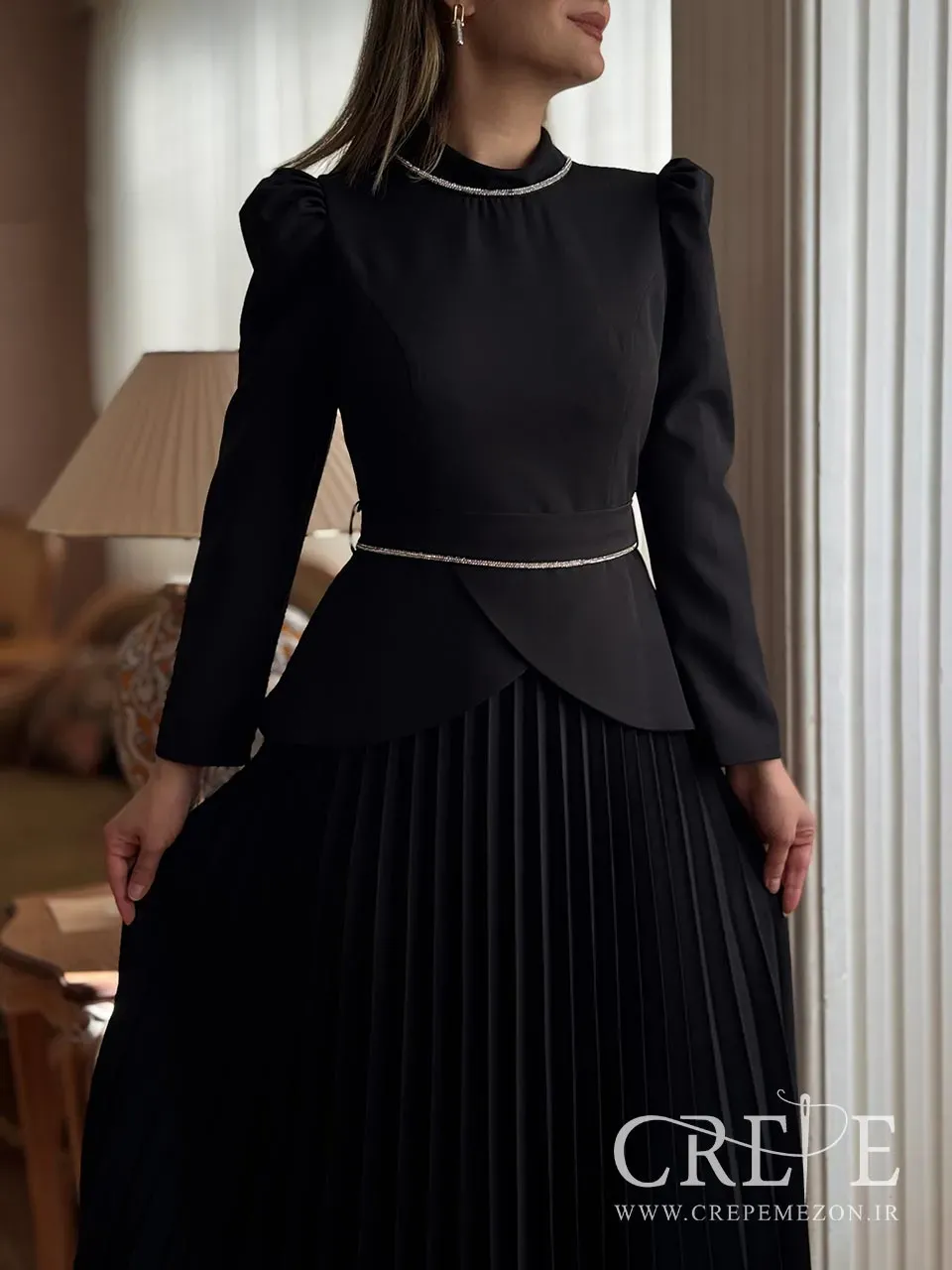 پیراهن میدی بالاتنه نواردوزی یک لباس پوشیده بلند و جذاب که در رنگ کرم، یشمی و مشکی طراحی شده است. یقهای بسته با جزئیات ظریف دارد که جلوهای شیک به پیراهن میبخشد. آستینها بلند هستند و در سرشانهها کمی پف دارند که به لباس حجم و شکلی خاص میدهد. بالاتنهی پیراهن ساده و بدون جزئیات اضافی است، اما این سادگی باعث نمیشود که از شیکی آن کاسته شود. دامن این پیراهن پلیسهدار است که به آن حالتی مجلل و فاخر میدهد. پلیسههای مرتب دامن، حرکت زیبایی ایجاد کرده و ظاهر کلی را بسیار دلنشین میکنند. همچنین پلیسه ها همیشه ترند و محبوب اند و بدون نیاز به تلاش خاصی شما را آراسته و مرتب می سازد. پلیسه ها از جمله طراحی هایی است که به گفته متخصصان مد هرگز قدیمی نمی شود و همیشه طرفداران خاص خودش را دارد.