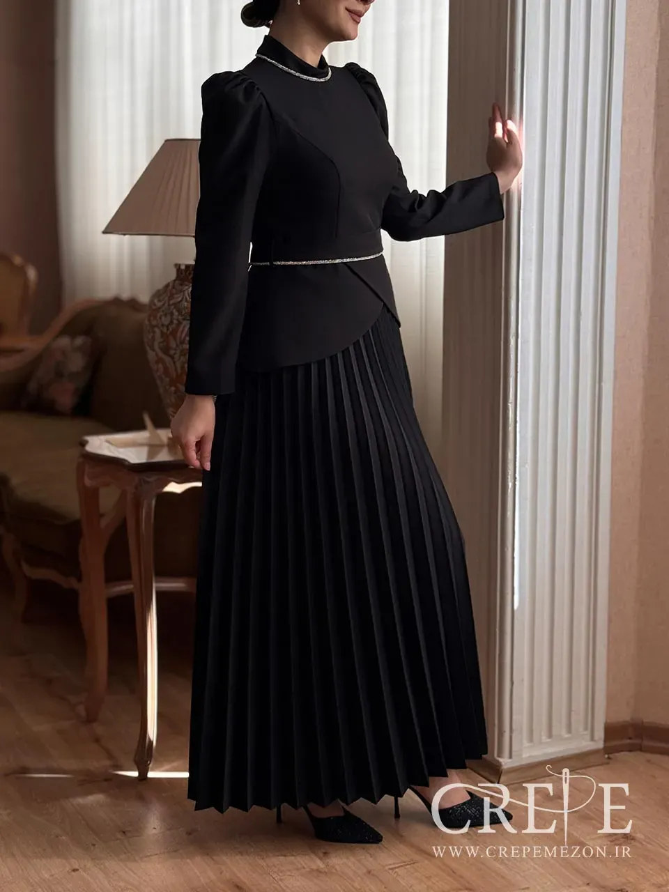 از آن جایی که این پیراهن میدی پوشیده طراحی مجلسی و در عین حال ساده ای دارد و مونوکروم است می توانید اکسسوری های پر زرق و برق نیز استفاده کرده و استایل تان را دلبر تر کنید. همانطور که می دانید با این پیراهن میدی پوشیده می توانید از گردنبند ساده با آویز بلند استفاده کنید که بیشتر ترقوه را نمایان کند. علاوه بر اینها گوشواره حلقهای انتخاب مناسبی برای این لباس میدی است. همچنین برای آرایش مو ها بهتر است از موی فر استفاده کنید تا با پلیسه های لباس هارمونی داشته باشد. فر کردن مو و بستن آن به صورت شلخته و پراکنده نیز میتواند ایده ی جالبی بوده و چشم ها را درگیر شما کند.