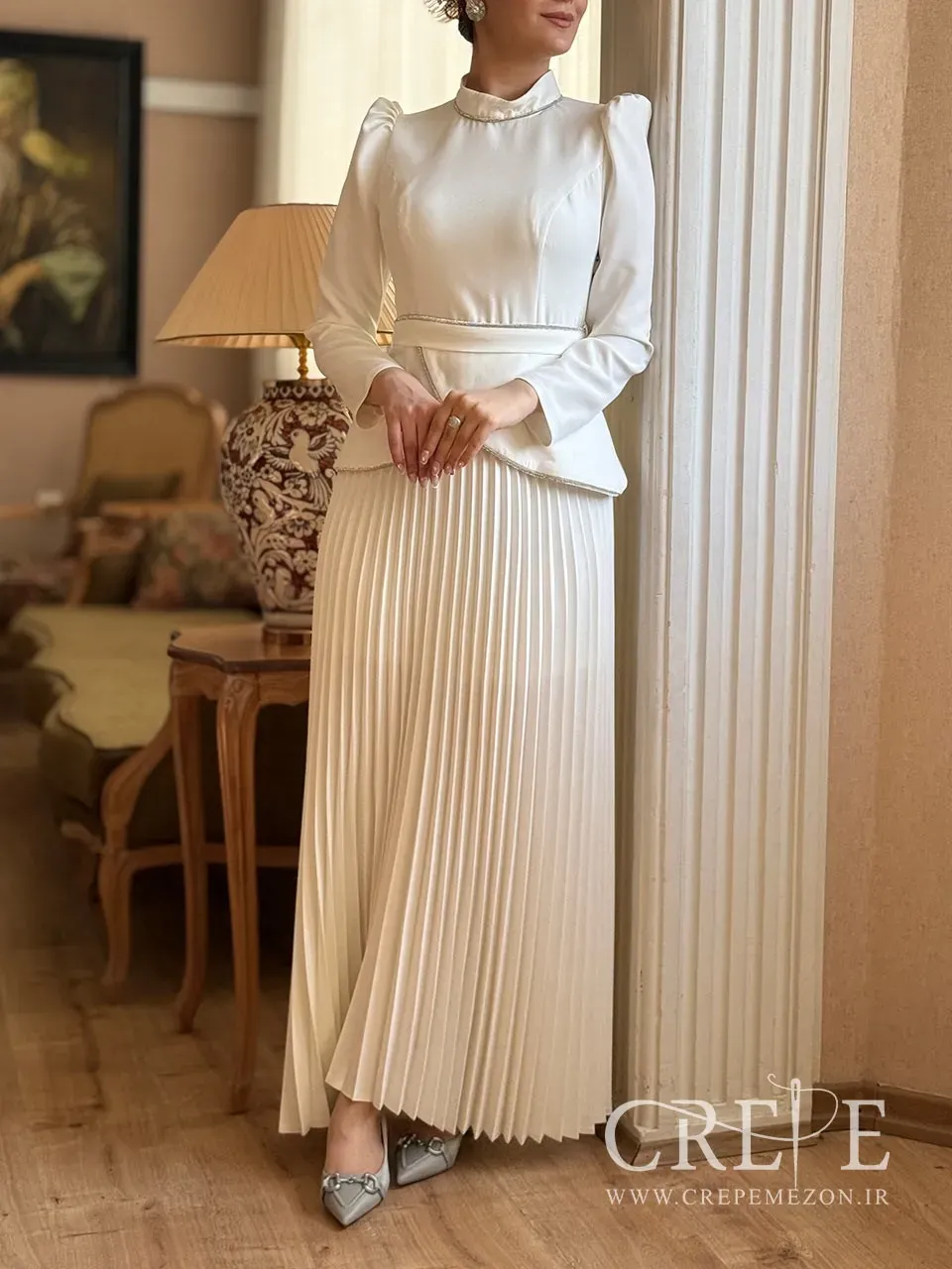 پوشیده بودن یکی از محبوب ترین آیتم ها برای خرید لباس های مجلسی است که در کنار زیبایی و تزییناتی مانند نواردوزی قابلیت این را دارد که در مراسم های مختلط نیز استفاده شود. بالاتنه این پیراهن پوشیده با نواردوزی که دارد باعث شده است کار از سادگی درآمده و چشم ها را به بازی بگیرد. همانطور که می بینید طراحی مینیمالی که دارد زیبا و مجلسی است. همچنین از آنجایی که آستین های بلند و پوشیده ای دارد، انتخاب های اکسسوری کمتری را پیش روی شما قرار می دهد، از این رو بدون نیاز به صرف زمان و یا تلاش خاصی استایل نهایی تان تکمیل خواهد بود. اما اگر قصد انتخاب گوشواره را داشتید حتما با توجه به بالاتنه لباس بهتر است در تنالیته رنگی نقره ای و طوسی انتخاب کنید.
