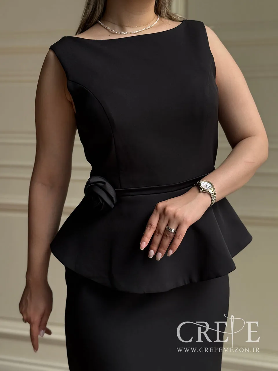 پیراهن میدی تک گل یک لباس مجلسی شیک که از جنس کرپ اعلا بوده و دارای طراحی ساده و شیک میباشد. قسمت بالاتنه آن بدون آستین است و یقه گرد دارد. در ناحیه کمر یک کمربند سفید رنگ قرار دارد که با یک گل رز سفید تزئین شده است. دامن این پیراهن به صورت مدادی (مدل تنگ) طراحی شده که تا زیر زانو ادامه دارد. قسمت پایین تنه لباس با استفاده از چینهای کوچک در ناحیه کمر کمی پف کرده و حالت پپلوم (دامن کوتاه روی لباس) یافته است که به لباس زیبایی خاصی میدهد. کفشهایی قرمز رنگ با پاپیون تزیینی نیز ترکیب جذابی با این پیراهن ایجاد کردهاند اما با این حال دست شما در انتخاب کفش باز خواهد بود.