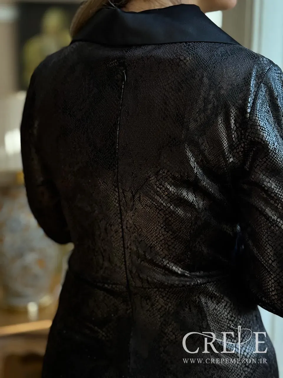پیراهن کوتاه پوست ماری طراحی شیک و خاصی دارد که از پارچه مخمل نرم و لطیف تهیه شده است. جنس مخمل، حس لوکسی را به شما منتقل میکند و طرح پوست ماری بر روی آن، جذابیت و منحصر به فردی به این لباس میبخشد. آستینهای بلند این پیراهن مجلسی ، زیبایی و الگانس را با خود به همراه دارد و آستینهای مچی نیز به شکل ظاهری آن جلوهای مدرن و بهروز میدهند. جنس پارچه برای یقه و سردست ها از جنس ساتن براق است که این تفاوت دو پارچه ترکیب ایده آلی ایجاد کرده است. همچنین همانطور که در تصویر می بینید یقه مردانه پهن این پیراهن کوتاه پوست ماری علاوه بر اینکه به آن حالتی کلاسیک میدهد، باعث میشود تا پوشیدن آن به آسانی انجام شود و گزینهای مناسب برای مجالس و مهمانیها باشد.