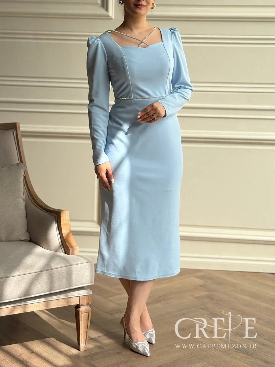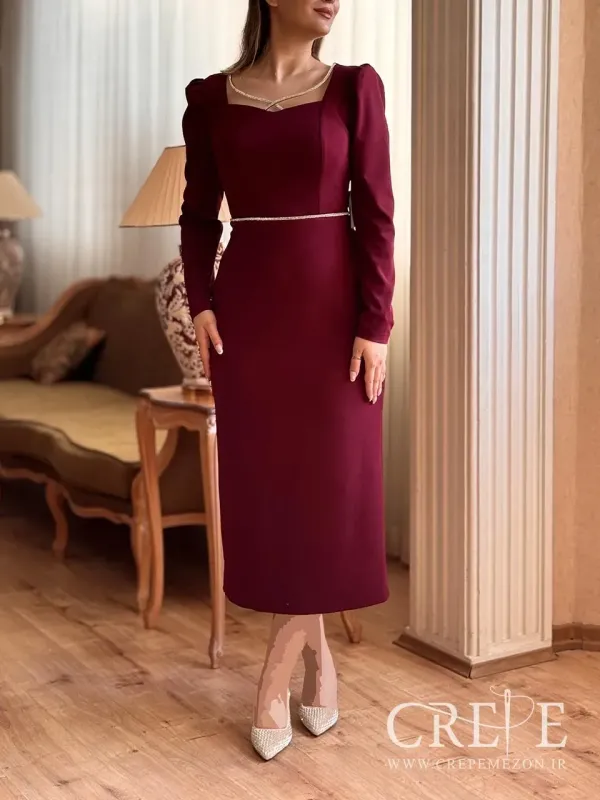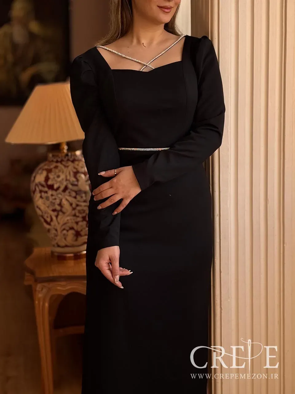 پیراهن نگین ریسه ای یقه خشتی یک لباس مجلسی شیک و کلاسیک که از جنس کرپ دالقیچ بوده و با طراحی خود، عمر بالایی در دایره مد دارد. همچنین خرید اقساطی نیز دارد.