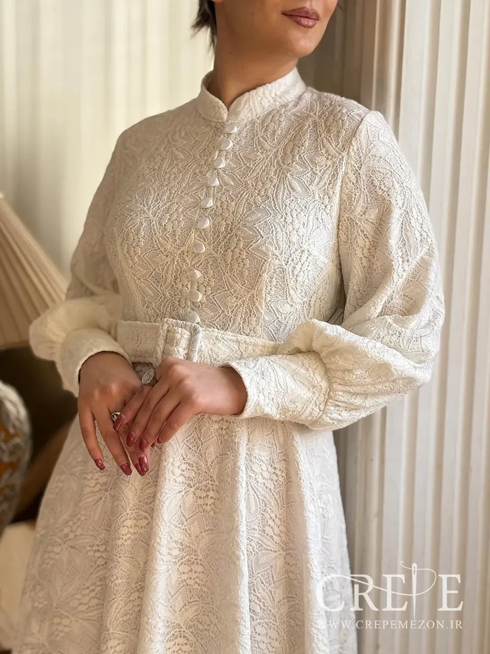 پیراهن گیپور طرح برگ یک پیراهن پوشیده مجلسی که از جنس گیپور بوده و دارای کاپ، آستر و کمربند می باشد. این پیراهن زیبا مصون از گذر زمان بوده و قدیمی نمی شود.