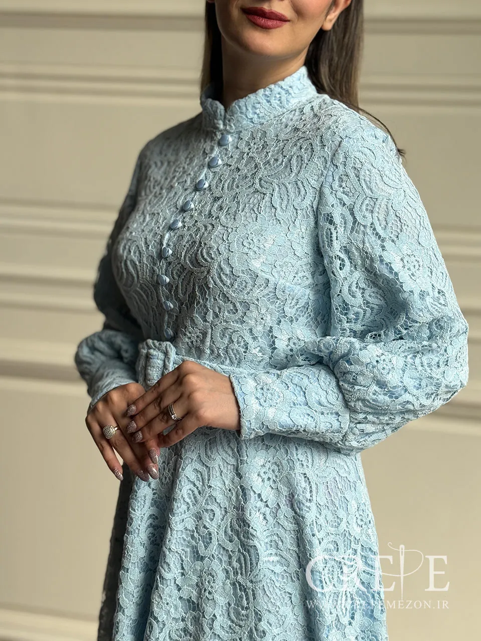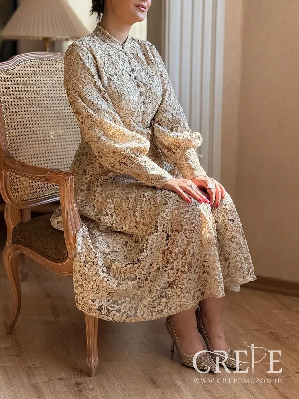 پیراهن مجلسی که از جنس گیپور و با قد میدی است، به دلیل طراحی و جنس خاص خود، میتواند استایلهای مختلفی را ایجاد کند. کفشهای پاشنهدار مشکی یا نقرهای میتوانند به زیبایی این پیراهن بیفزایند. از جواهرات ساده و کلاسیک مانند یک گردنبند نقرهای یا گوشوارههای کوچک استفاده کنید. یک کیف دستی کوچک و شیک به رنگ مشکی یا نقرهای انتخاب کنید. کفشهای بالهای یا پاشنه کوتاه به رنگ نخودی یا سرمهای. از جواهرات با طراحی ساده و مدرن استفاده کنید. از آن جایی که یقه آن ایستاده است به استفاده از گوشواره می توانید بسنده کنید.