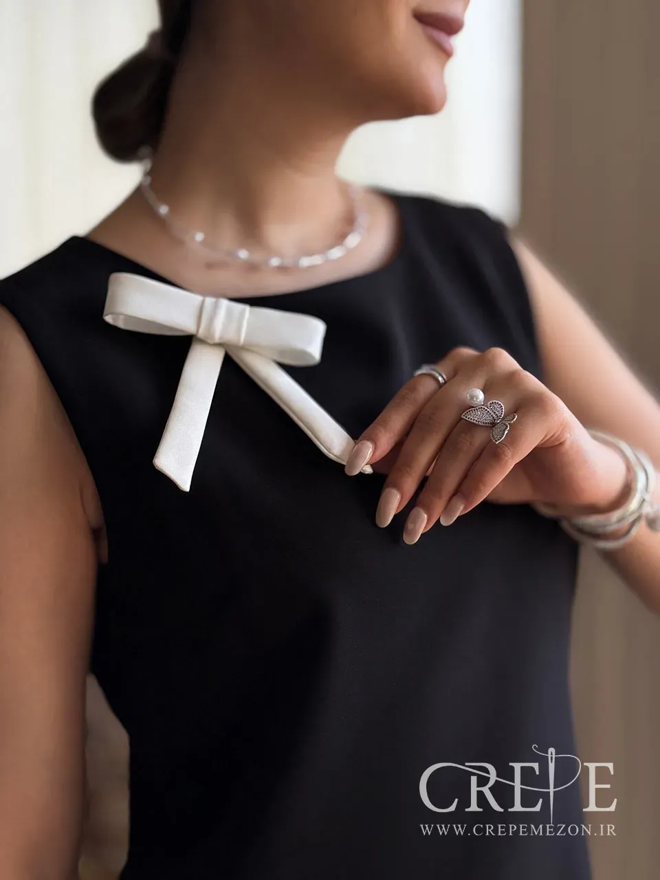 یقه گرد این لباس مجلسی ساده و ظریف است که به لباس یک ظاهر کلاسیک و در عین حال مدرن میدهد. رنگ اصلی لباس مشکی است که با پاپیون سفید و پلیسههای سفید در پایین، تضاد رنگی جذابی ایجاد میکند. این لباس مجلسی در سایزبندی 38 تا 46 موجود است، بنابراین برای اندازههای مختلف مناسب است. قسمت پایین پیراهن با پلیسههای زیبا و منظم در رنگ سفید تزیین شده است، که حرکت و حجم زیبایی به دامن میدهد و ظاهر لباس را بیشتر مجلسی و پرانرژی میکند. آستینها حلقهای هستند و انتخاب خوبی در تابستان ها هستند و ظاهری جمع و جور و شیک دارند.
