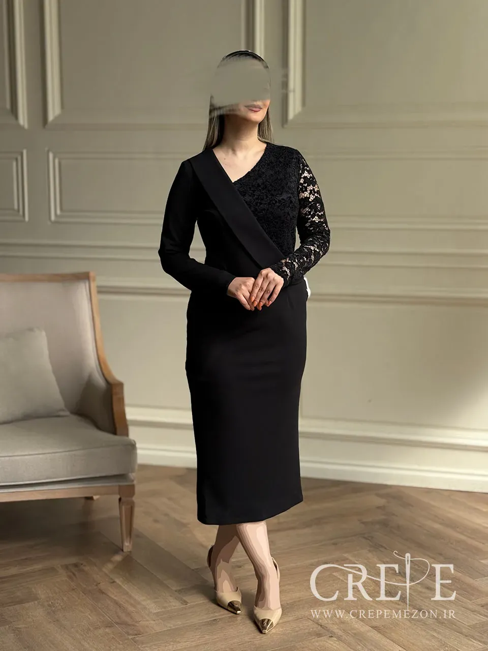 یکی از ویژگیهای برجسته این پیراهن یکطرفه گیپور مخمل استفاده از دو نوع پارچه مختلف در بالاتنه آن است. سمت راست بالاتنه با پارچهای ساده و مات پوشانده شده، در حالی که سمت چپ دارای آستین بلندی از جنس تور شفاف همراه با طرحهای گیپور مشکی ظریف میباشد. آستین سمت راست ساده و بدون هیچ تزئینی بوده اما آستین چپ شفافیت خاصی دارد و بر روی آن نقوش گلدار به کار رفتهاند که جلوهی بسیار زیبا و زنانهای به این لباس دادهاند. کمر لباس با دوخت دقیق نشسته نشان داده شده تا فرم ساعتشنی بدن را بیشتر نمایان کند. پایین پیراهن کاملاً صاف بوده و تا زیر زانو ادامه دارد، بدون هیچ چین یا پف اضافی.