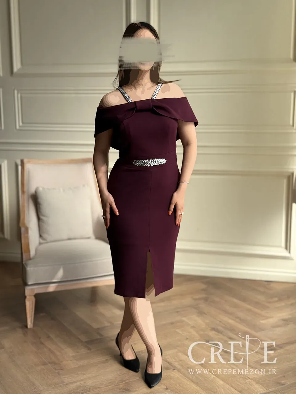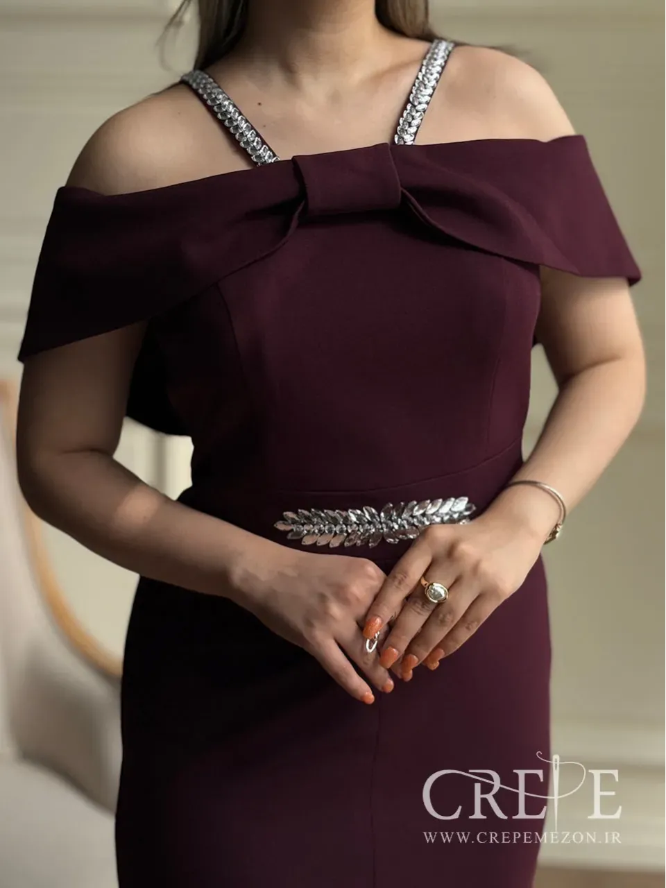 طراحی آن ترکیبی است از یقه قایقی و دو بند روی سرشانه، که ظاهری منحصر به فرد و مدرن ایجاد میکند. این بندها روی سرشانه قرار دارند و وظیفه ی نگهداری لباس را برعهده داشته و به استایل کلی لباس جذابیت می افزایند. دور کمر این پیراهن نیز با نگین های زیبا تزیین شده است، که نقش مهمی در جذابیت و جلوه آن دارد. این نگینها در قسمت کمر، شکل و رنگبندی متنوع دارند و به لباس حالتی مجلل و فاخر میبخشند. طراحی این پیراهن پاپیونی اندامی است، یعنی بر فرم بدن بسیار منطبق و فیت است، و خطوط بدن را به شکل زیبا نشان میدهد.